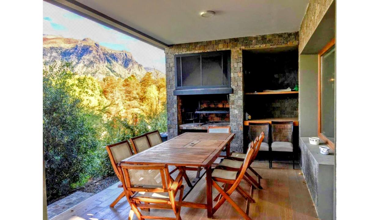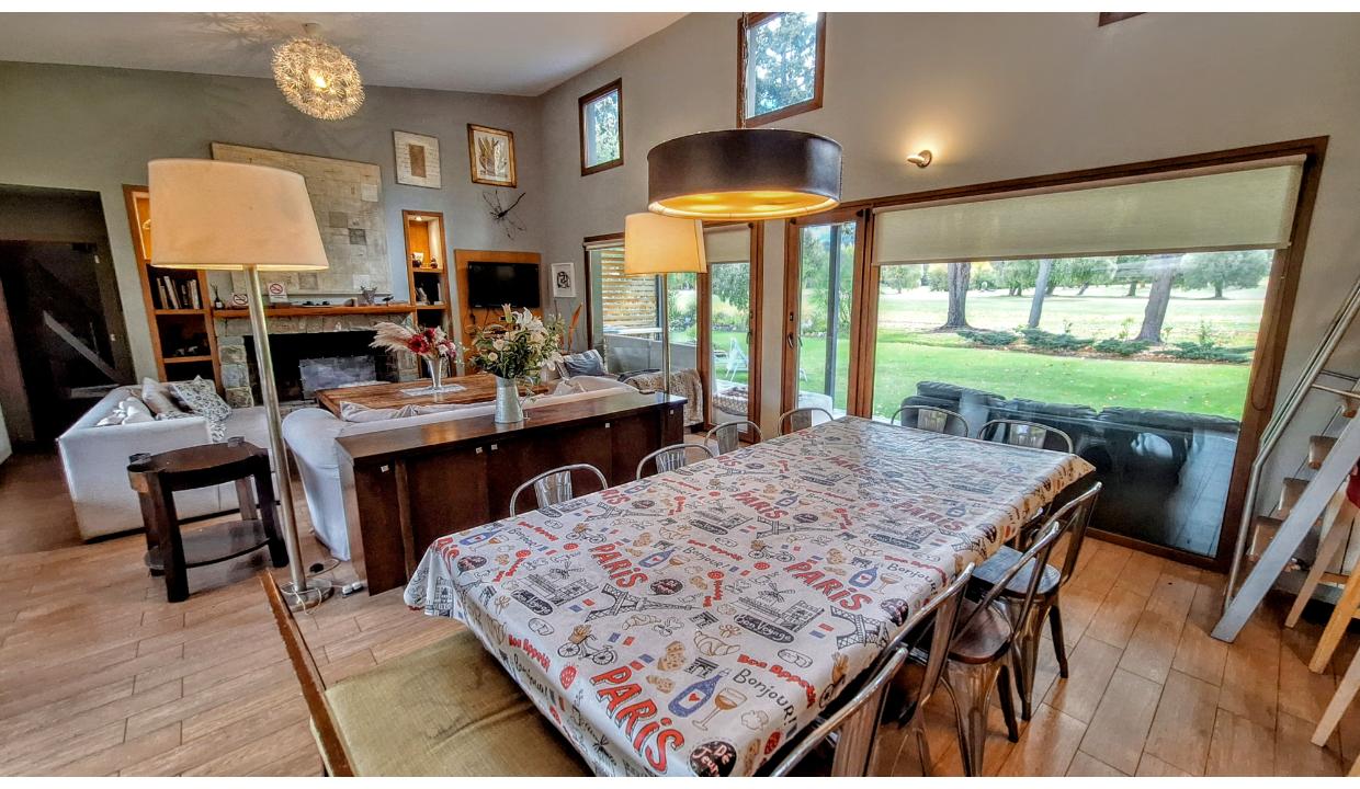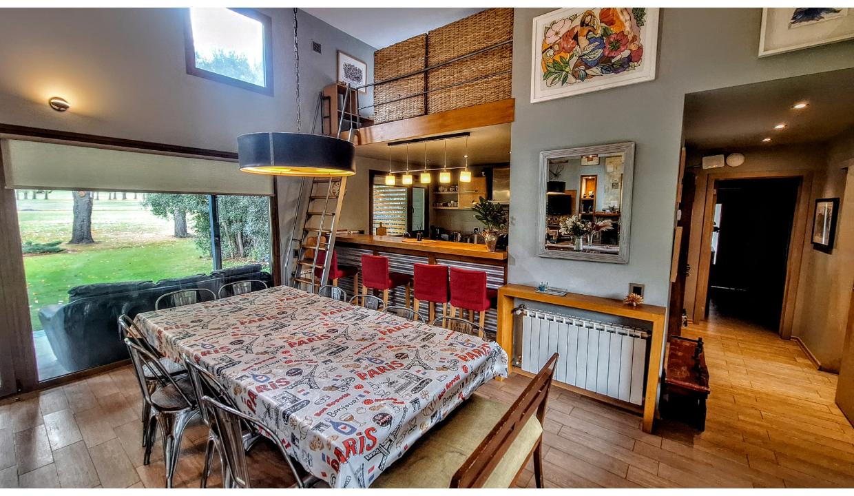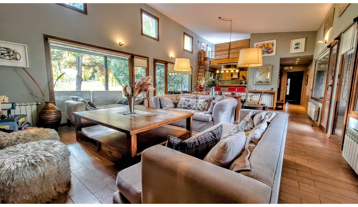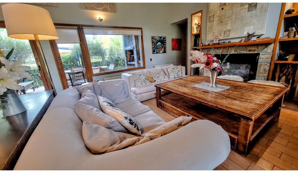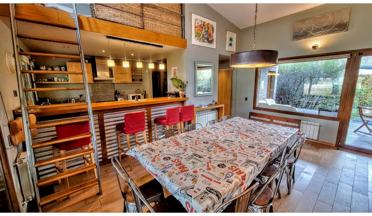 *cocina con barra y asientos *living/comedor con chimenea, sofa cama doble, mesita comedor con 4 sillas *Toilette en planta baja *galería techada con parrilla y living externo