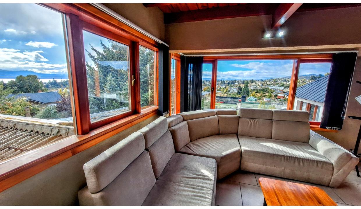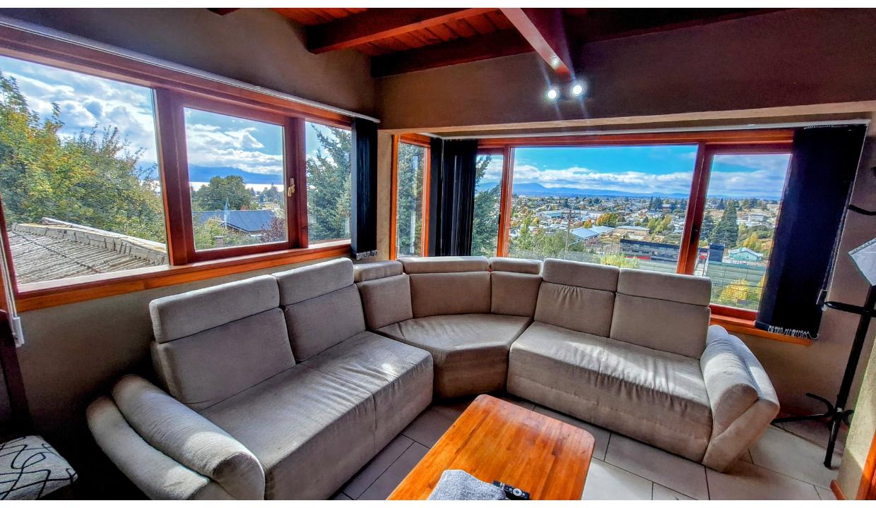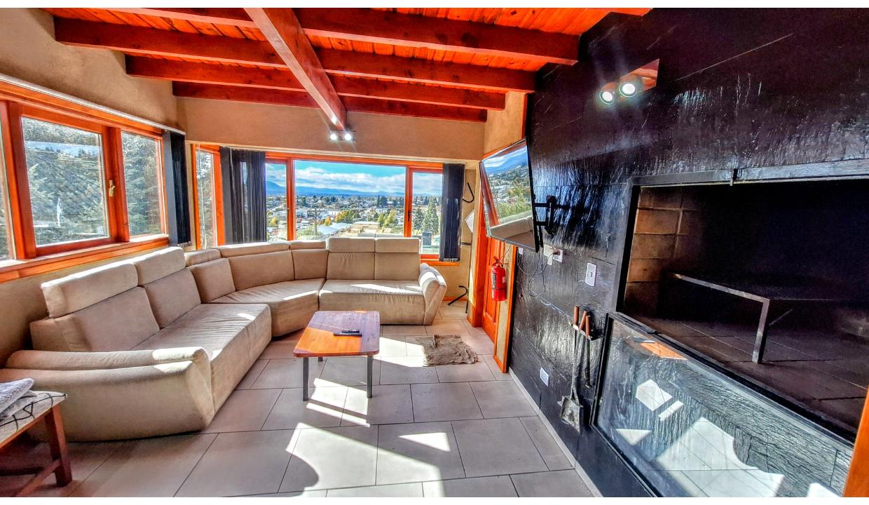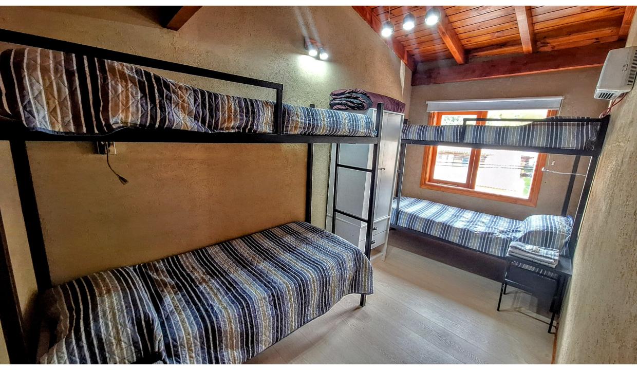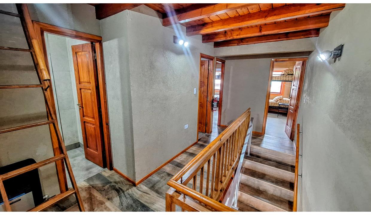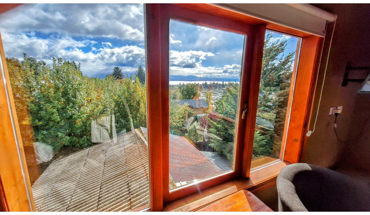 Casa en 2 plantas con capacidad hasta 16 personas, a 10 cuadras del centro. Se ingresa por escalera al living, con vista a la ciudad y parrilla interna, cocina comedor super equipada y un baño con ducha escocesa. En el segundo piso se encuentran 3 habitaciones: 1 con matrimonial + cuchetas, con vista a la ciudad y al lago; y las otras 2 con 2 camas cuchetas. Otro baño con ducha escocesa. Y en el altillo se encuentra la otra habitación con 1 camas cuchetas y una matrimonial+ toilette. Estacionamiento para 2 autos dentro de la propiedad ( cerrado pero sin techo).