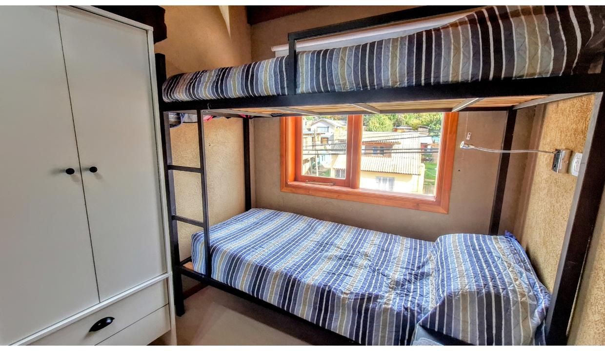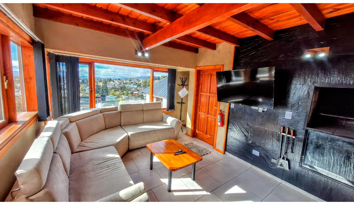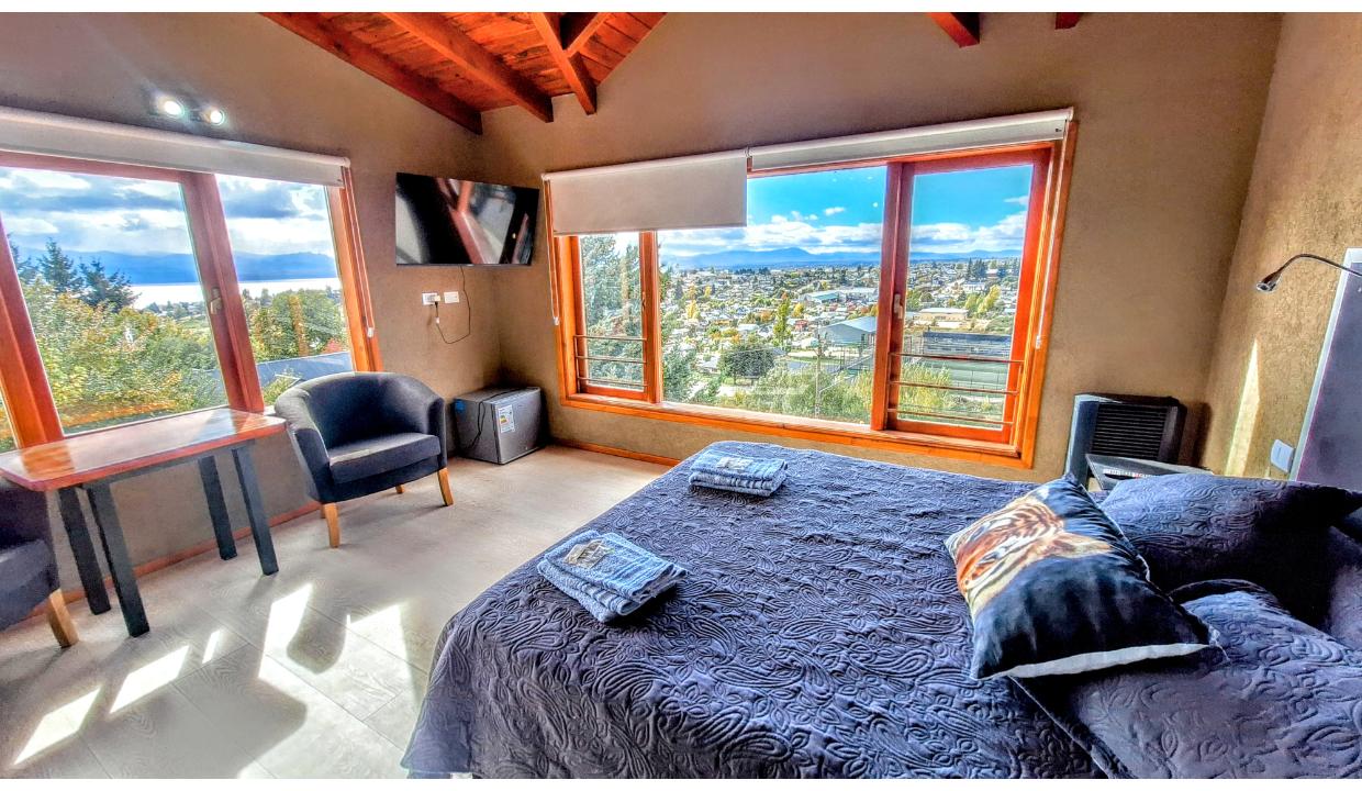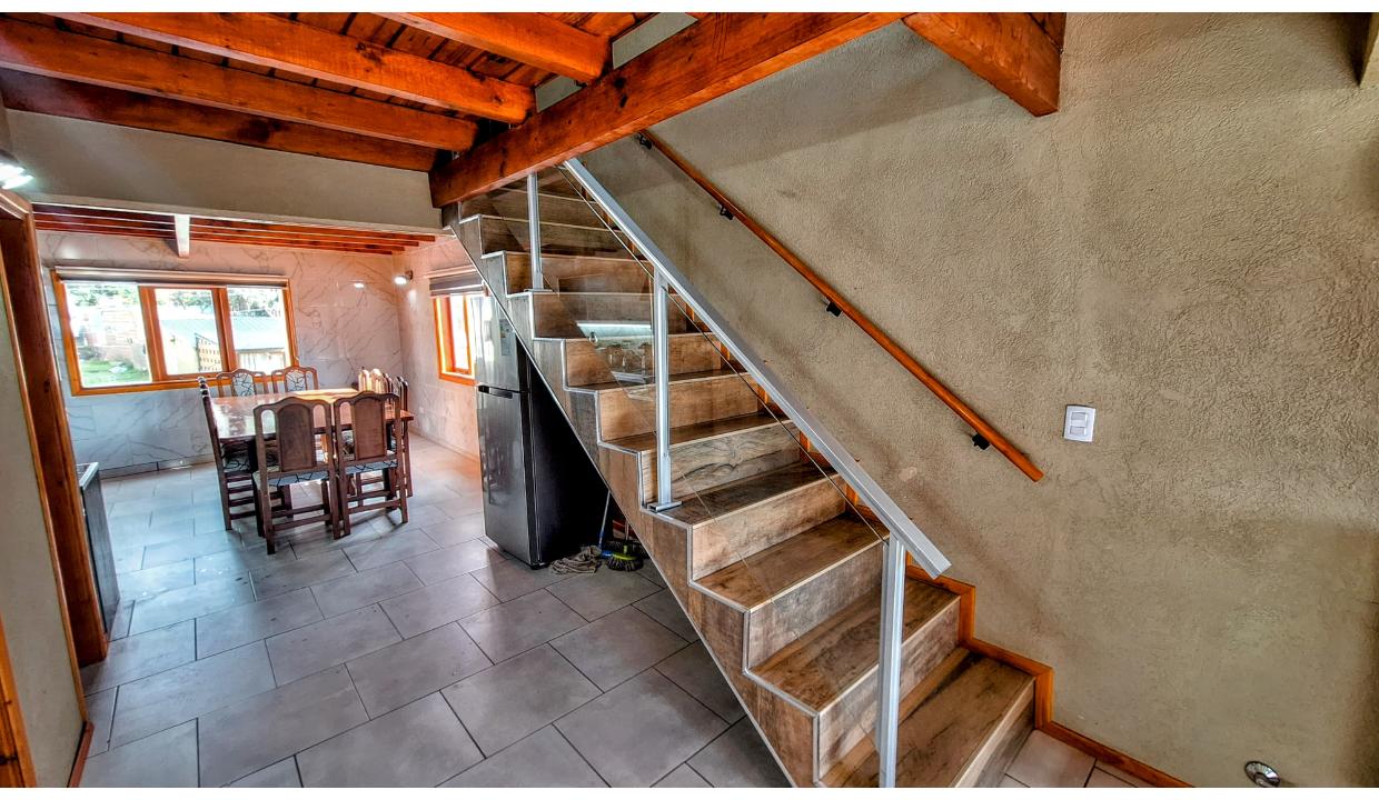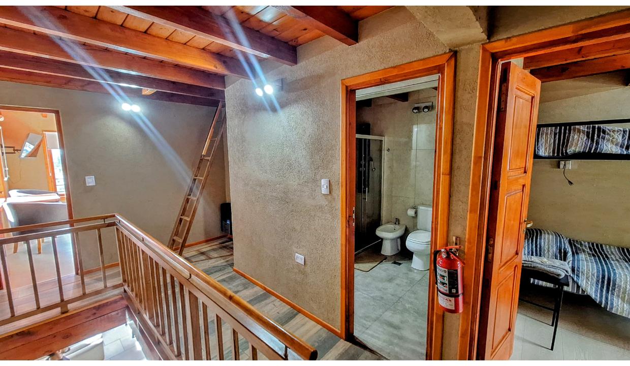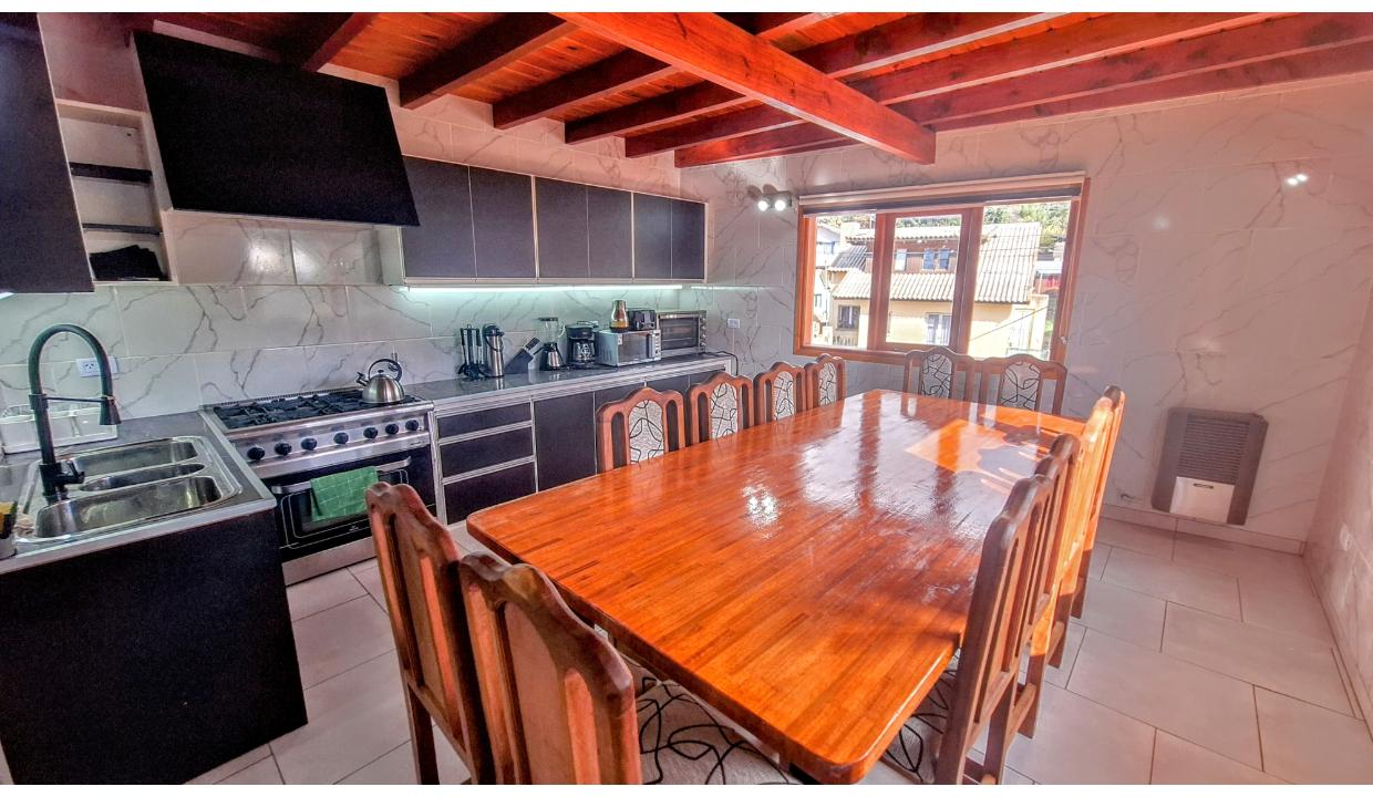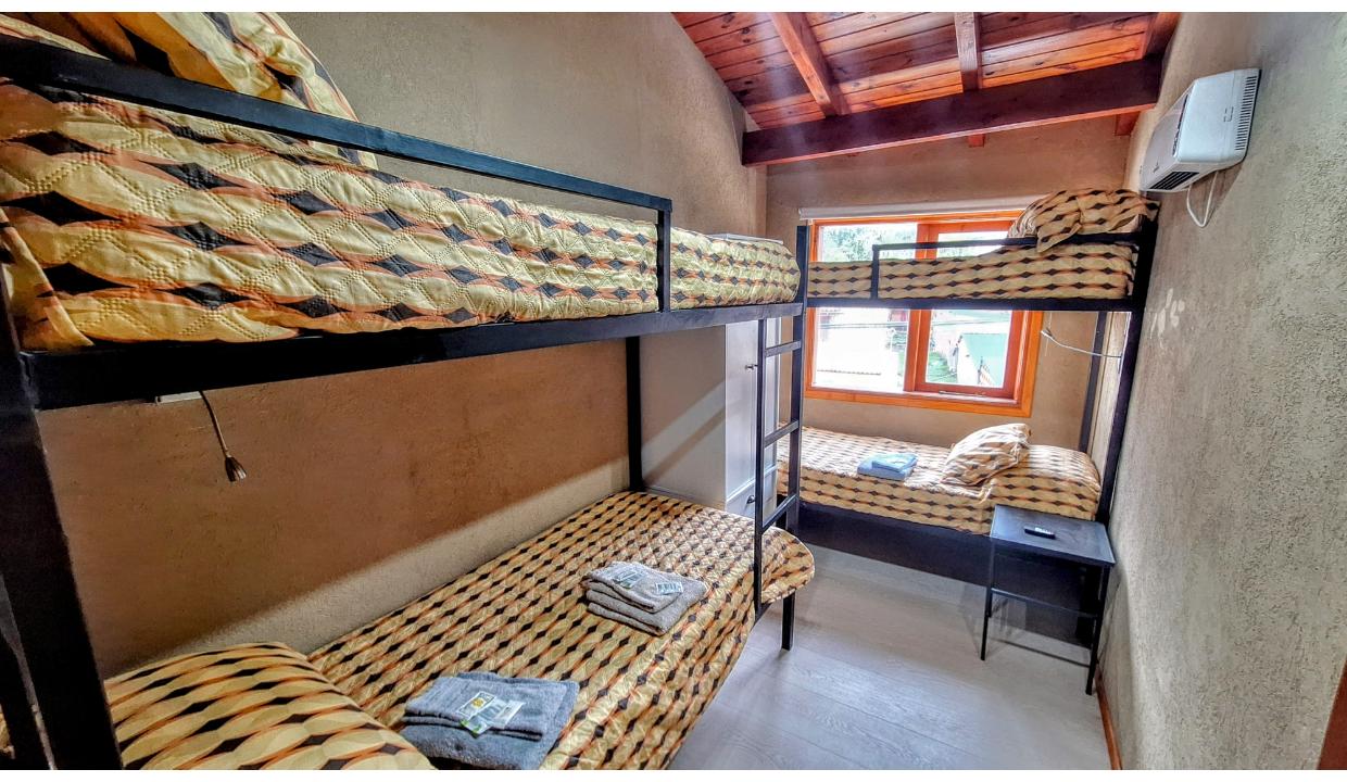 Casa en 2 plantas con capacidad hasta 16 personas, a 10 cuadras del centro. Se ingresa por escalera al living, con vista a la ciudad y parrilla interna, cocina comedor super equipada y un baño con ducha escocesa. En el segundo piso se encuentran 3 habitaciones: 1 con matrimonial + cuchetas, con vista a la ciudad y al lago; y las otras 2 con 2 camas cuchetas. Otro baño con ducha escocesa. Y en el altillo se encuentra la otra habitación con 1 camas cuchetas y una matrimonial+ toilette. Estacionamiento para 2 autos dentro de la propiedad ( cerrado pero sin techo).