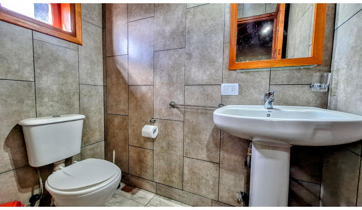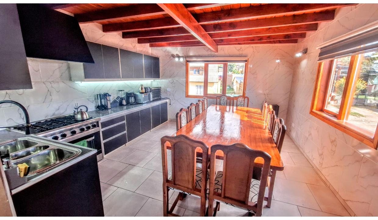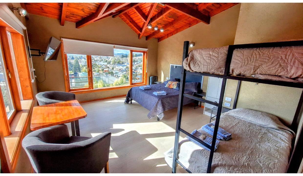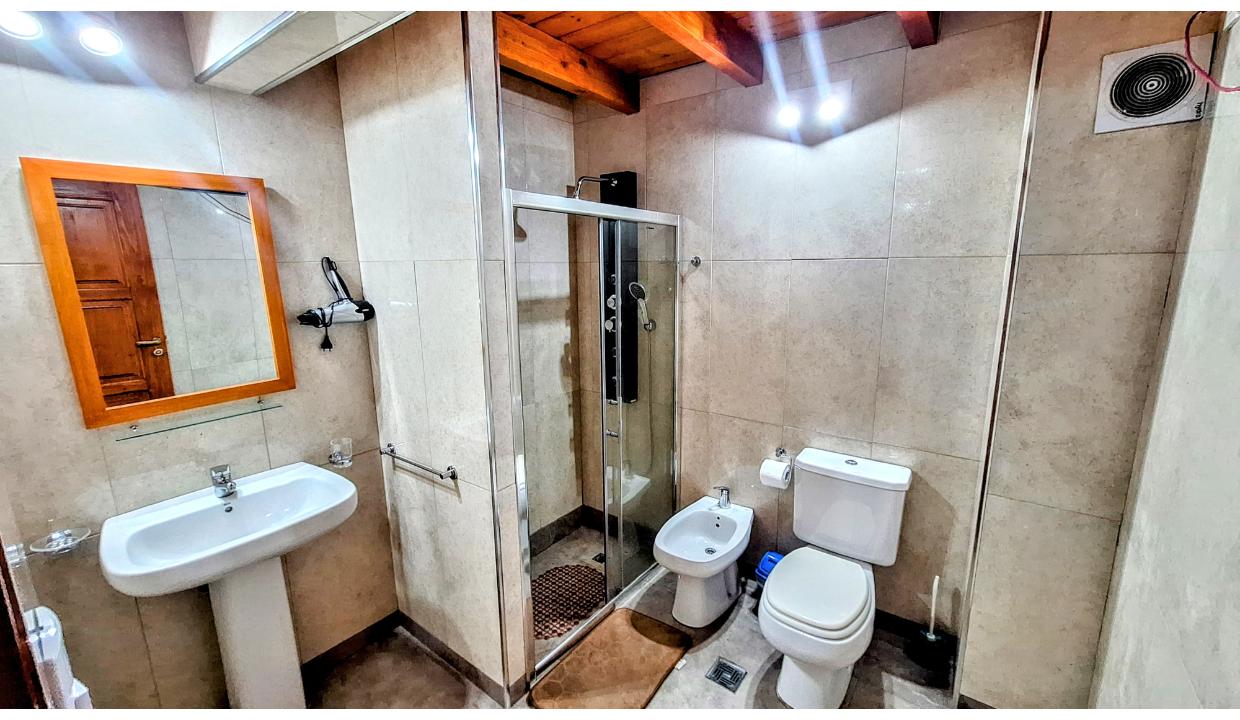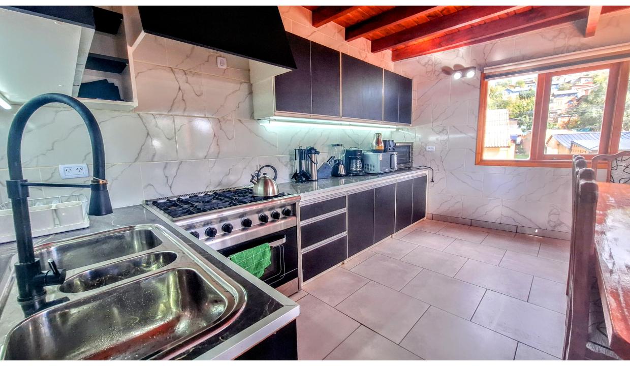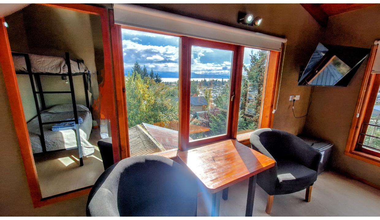 Casa en 2 plantas con capacidad hasta 16 personas, a 10 cuadras del centro. Se ingresa por escalera al living, con vista a la ciudad y parrilla interna, cocina comedor super equipada y un baño con ducha escocesa. En el segundo piso se encuentran 3 habitaciones: 1 con matrimonial + cuchetas, con vista a la ciudad y al lago; y las otras 2 con 2 camas cuchetas. Otro baño con ducha escocesa. Y en el altillo se encuentra la otra habitación con 1 camas cuchetas y una matrimonial+ toilette. Estacionamiento para 2 autos dentro de la propiedad ( cerrado pero sin techo).