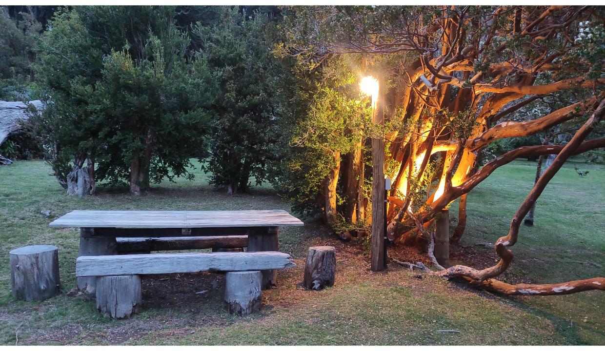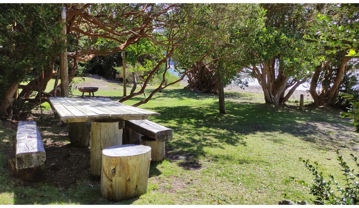 • Mesa rústica de madera y Parrilla/fogonero entre los Arrayanes en la costa.