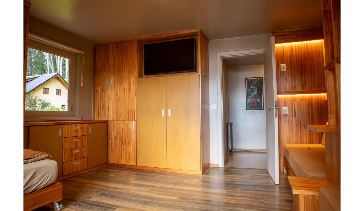 mesada escritorio y TV.LED 32”. Con vista hacia el jardín lateral.