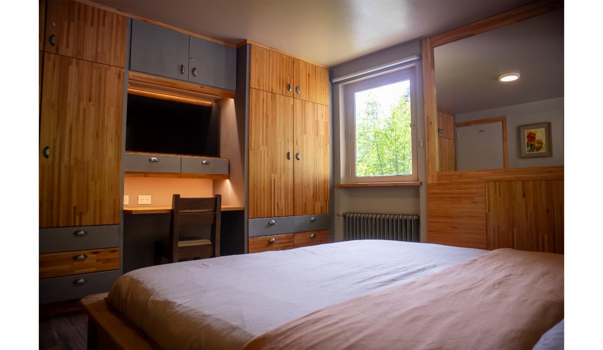 • Dormitorio matrimonial con cama Queen, Placard con escritorio y pantalla TV Smart 4K de 43”, con vistas