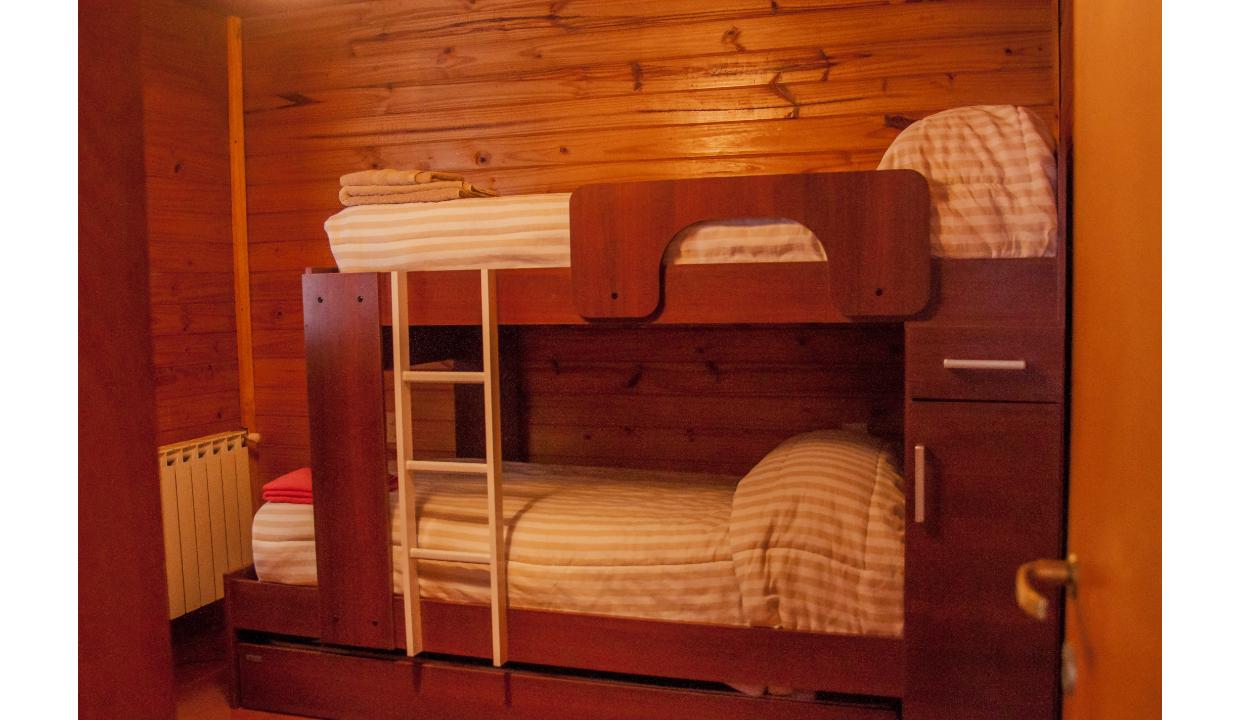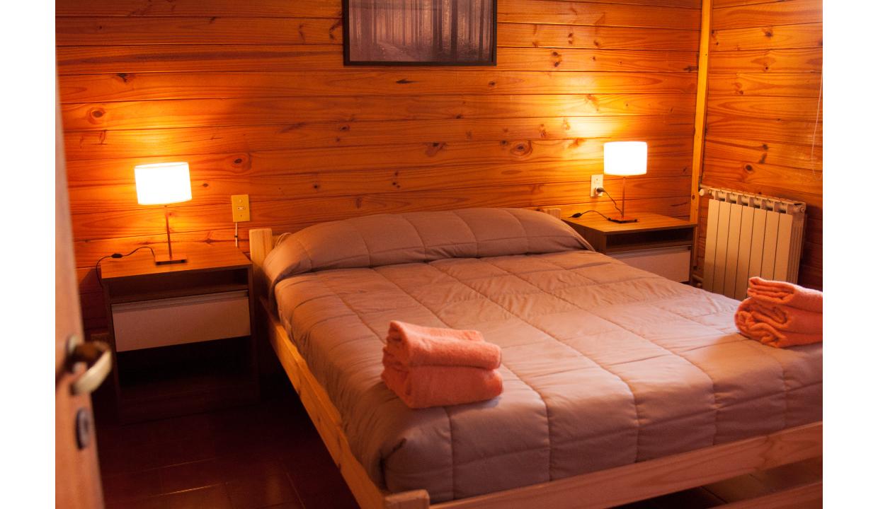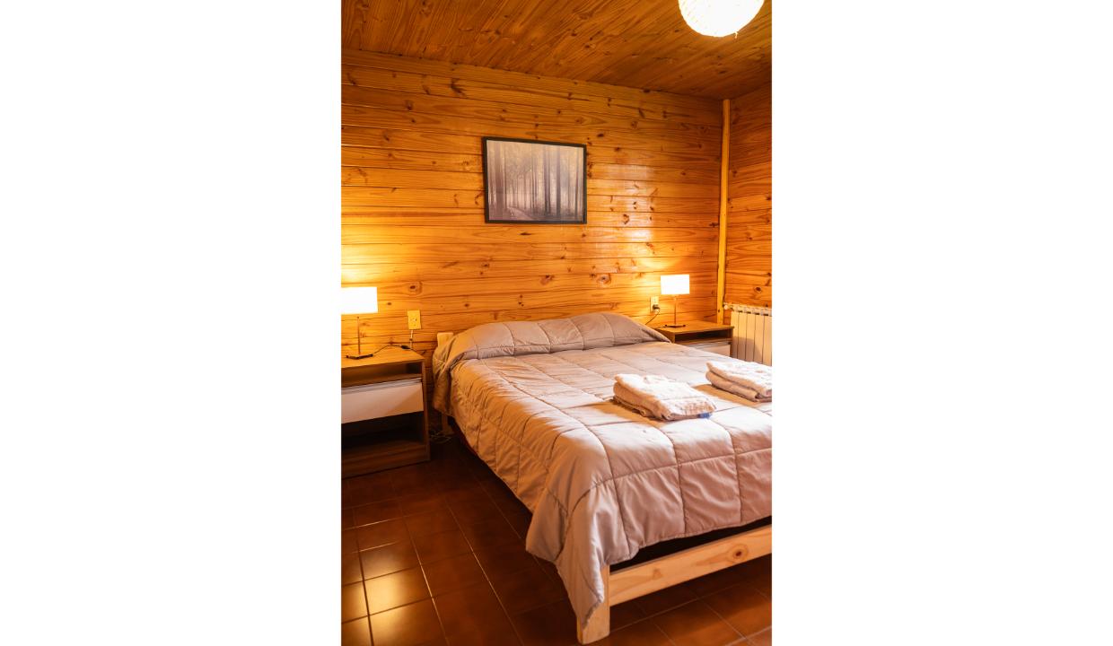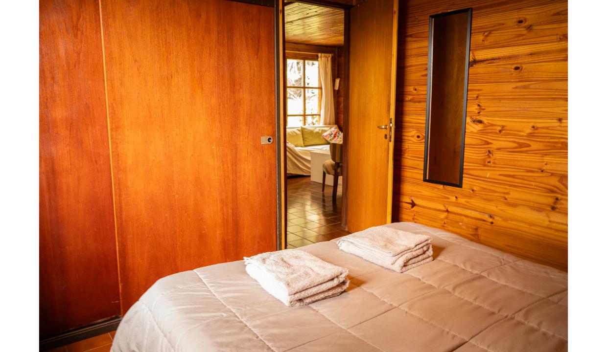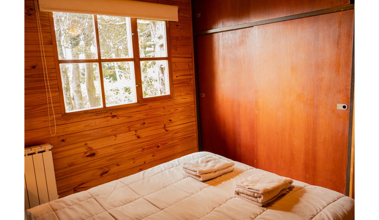 Cuenta con living-comedor con tv y cocina integrada, 2 dormitorios, uno con una cama de dos plazas y vista al lago; y otro con tres camas (una cama cucheta y un carricama) con vista al bosque.
