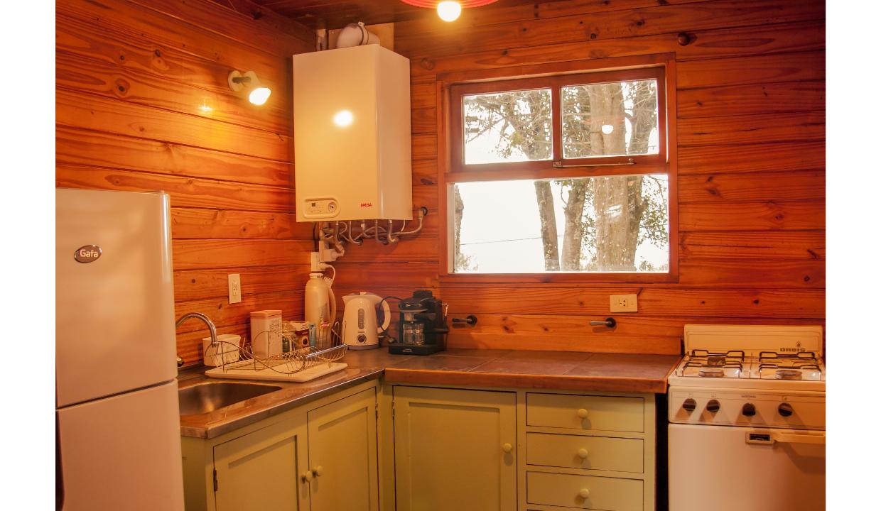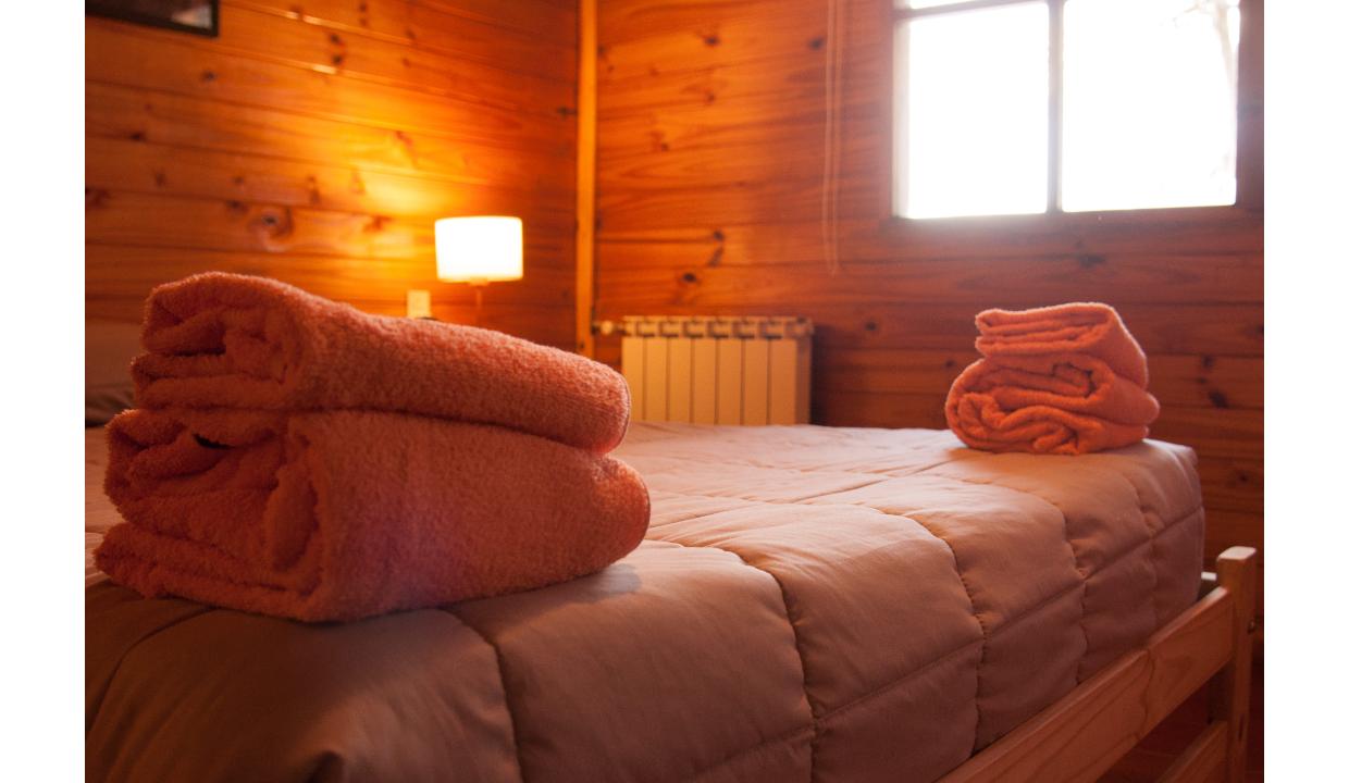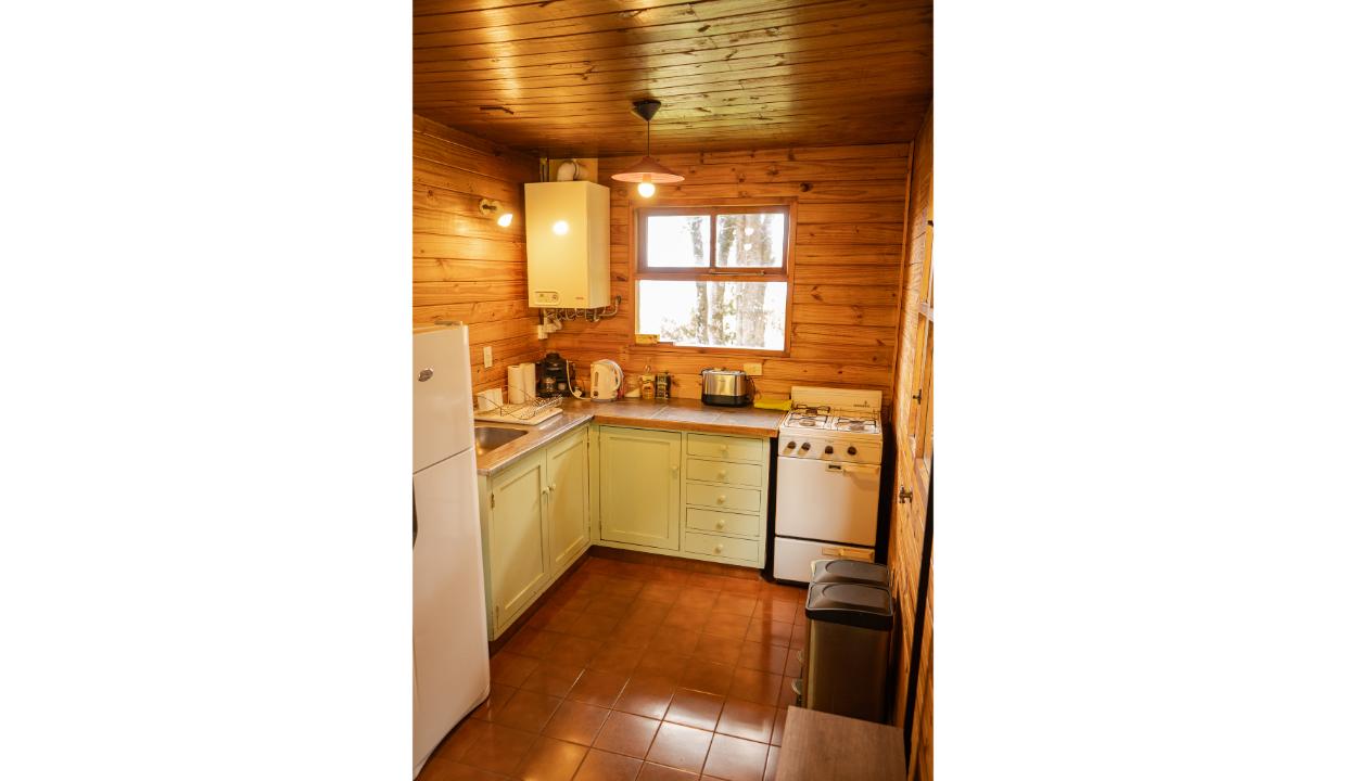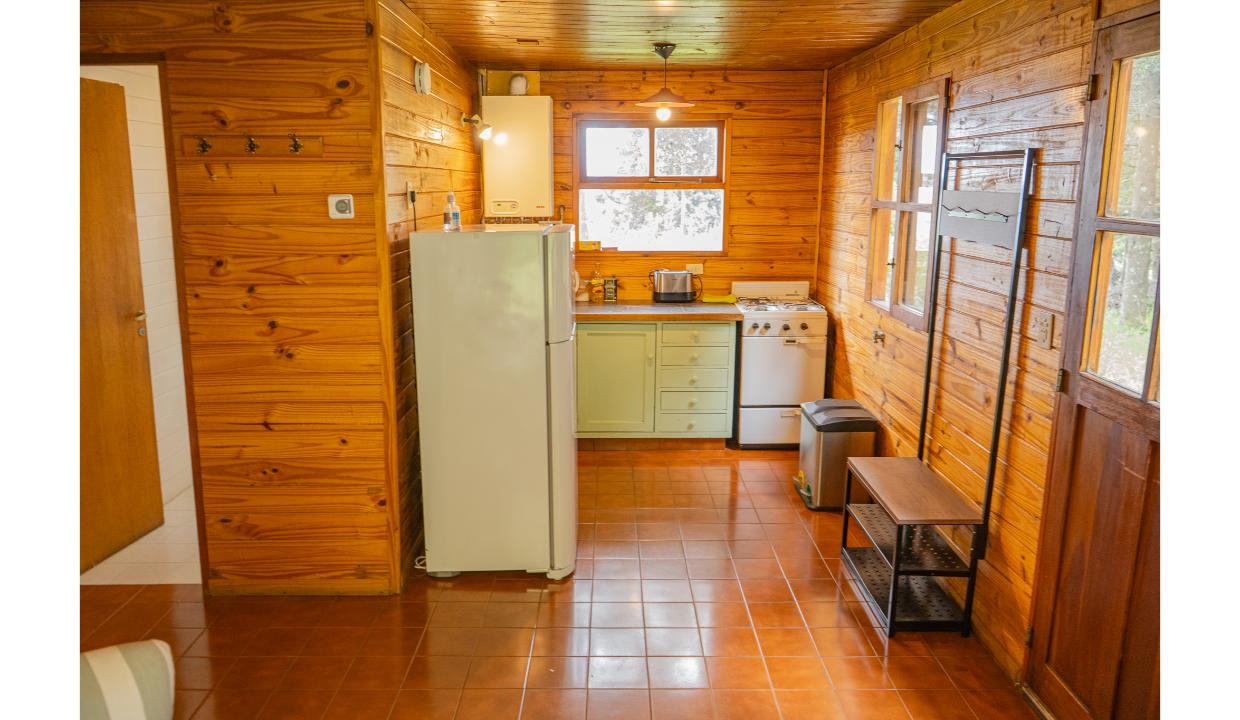 Cuenta con living-comedor con tv y cocina integrada, 2 dormitorios, uno con una cama de dos plazas y vista al lago; y otro con tres camas (una cama cucheta y un carricama) con vista al bosque.