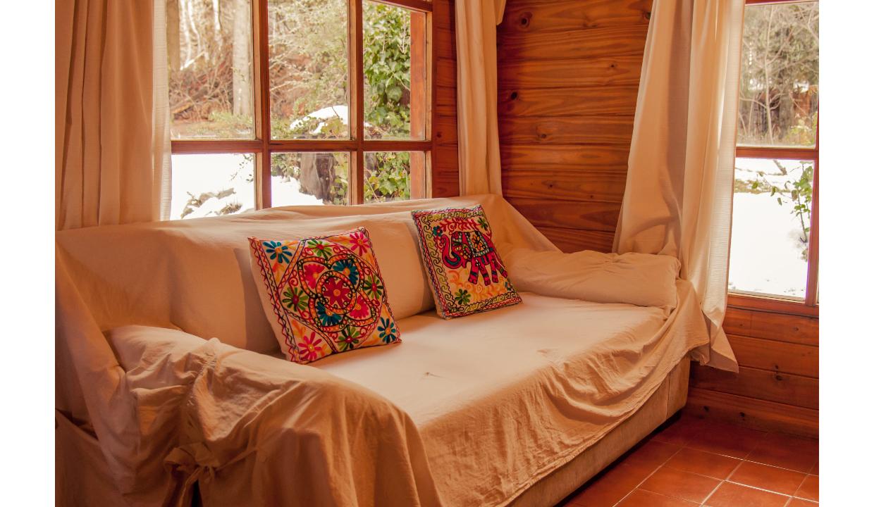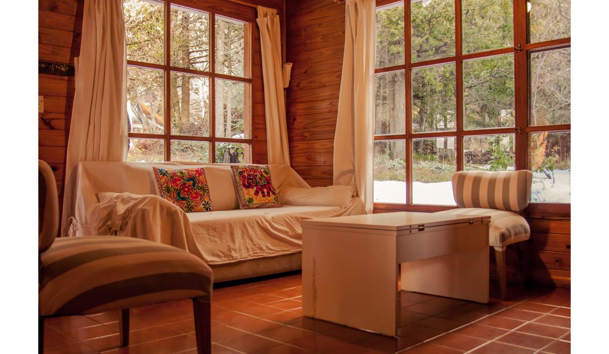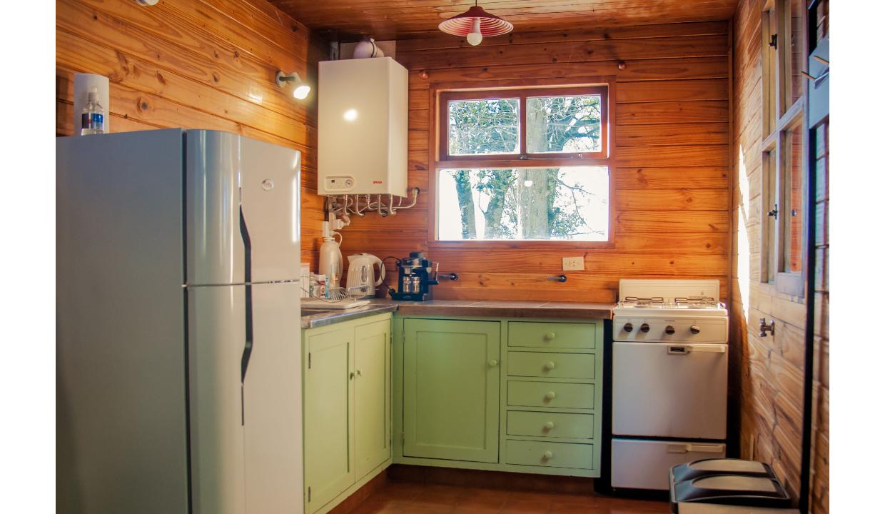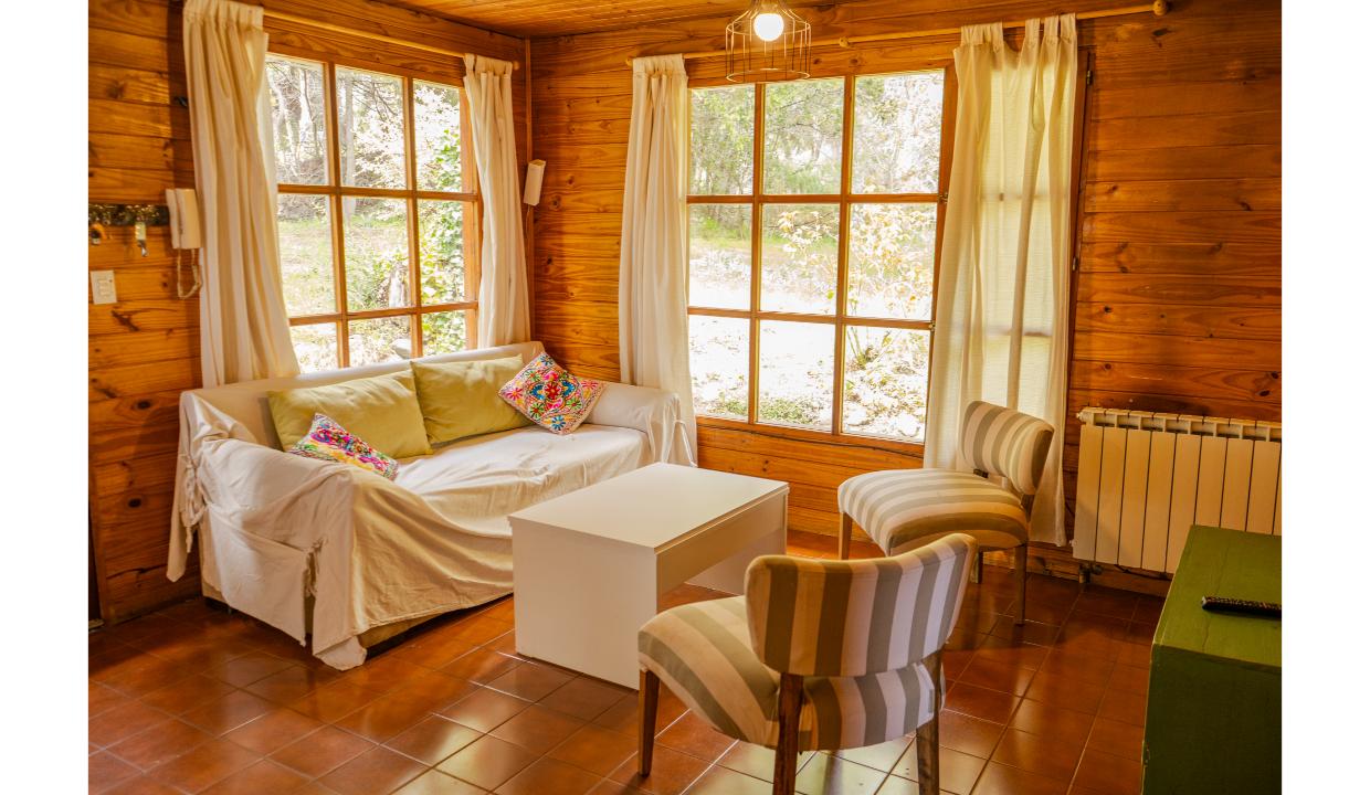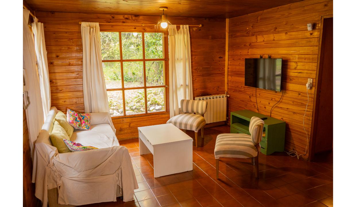 Cuenta con living-comedor con tv y cocina integrada, 2 dormitorios, uno con una cama de dos plazas y vista al lago; y otro con tres camas (una cama cucheta y un carricama) con vista al bosque.