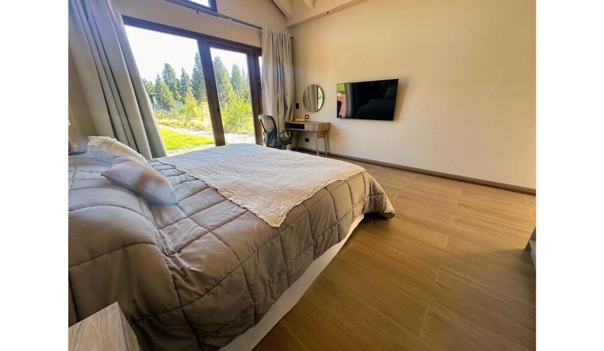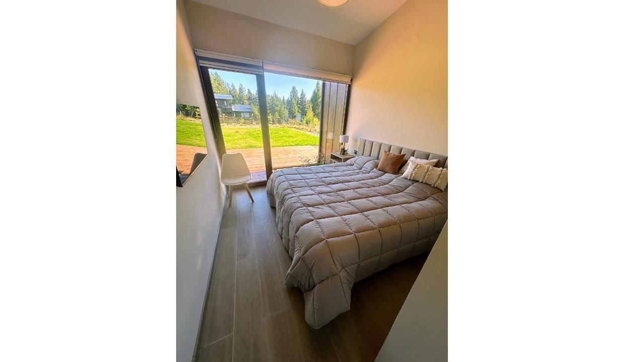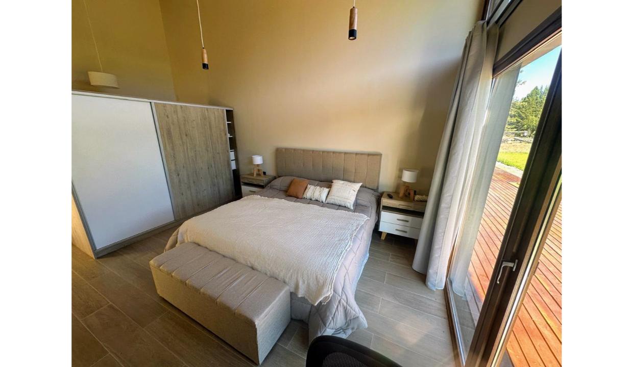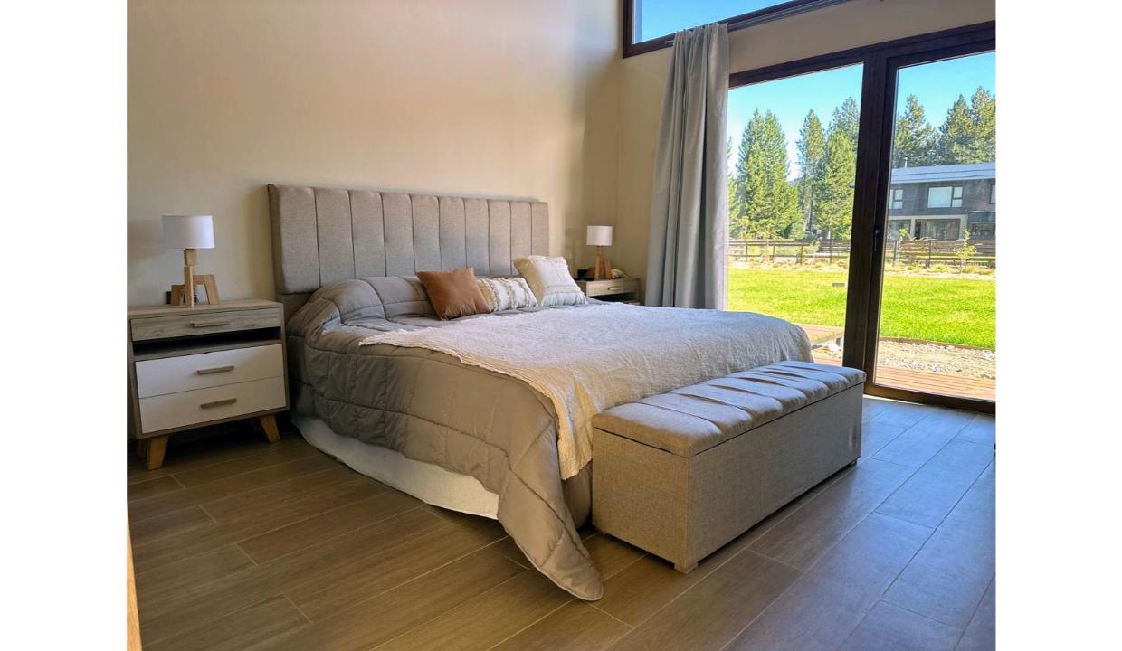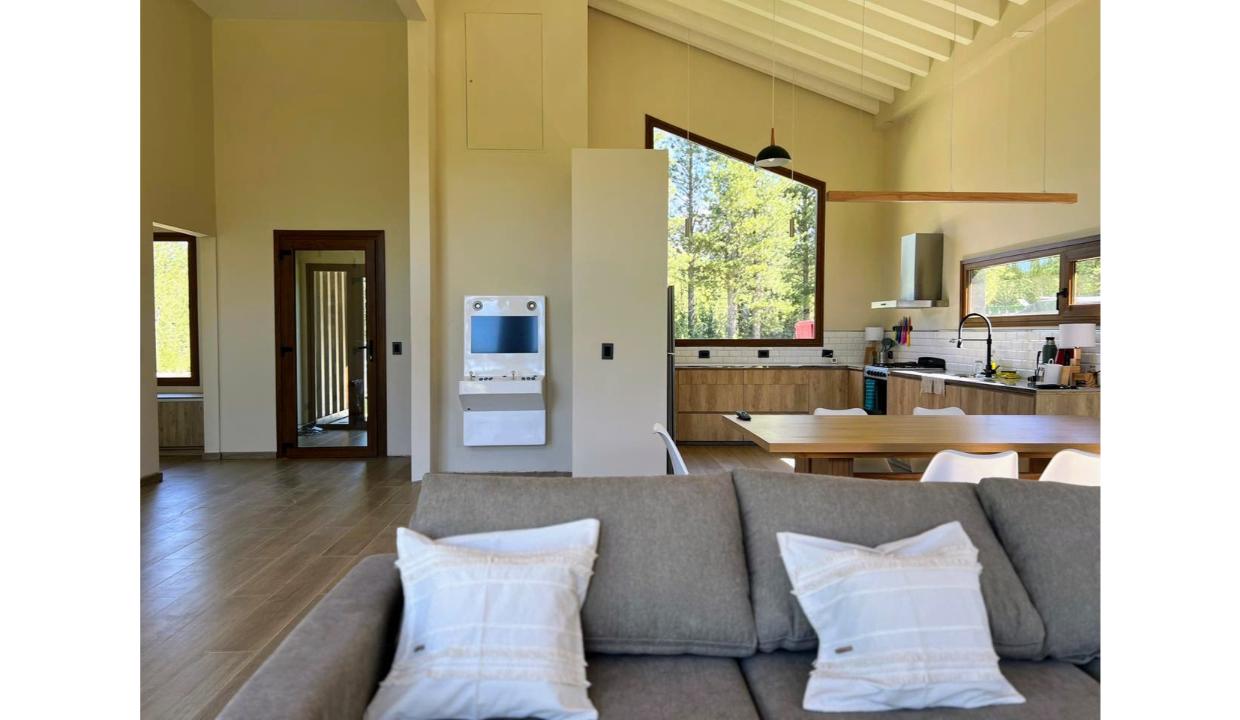 Casa con muy buen estilo, y con muy amplios y comodos ambientes. Planta única de 160m2 rodeada de jardines y bosques con vistas al jardin y a las montañas . La casa esta compuesta por un cuarto frio, toilette en la entrada. Equipada para un máximo de 6 personas, cuenta con un amplio living, un comedor, lugar para escuchar musica en vinilo, y una maquina de juegos Retro. Cómoda cocina con todo lo necesario para una larga estadia. Tiene 3 dormitorios, distribuidos de la siguiente manera: Dormitorio 1: El principal muy amplio, cama King size, con baño en suite (ducha escocesa) con salida al deck. Excelente placard. Dormitorio 2: con cama matrimonial Queen size y placard. Dormitorio 3: con dos camas cuchetas. Baño completo compartido para los dos dormitorios. Lavadero completo. Pileta para lavado y lavarropas con espacio para colgado de ropa, con su tender. Deck con salida desde el comedor y del living, como asi tambien de los dormitorios. Parrilla en la zona del deck. Seguridad permanente en el barrio y acceso a canchas, gym, piscina climatizada, senderos de trekking y espacios deportivos del barrio.