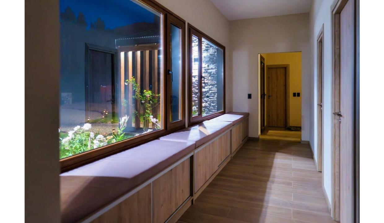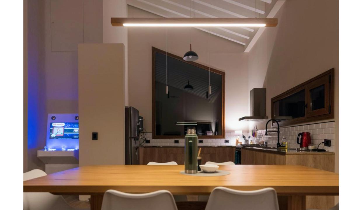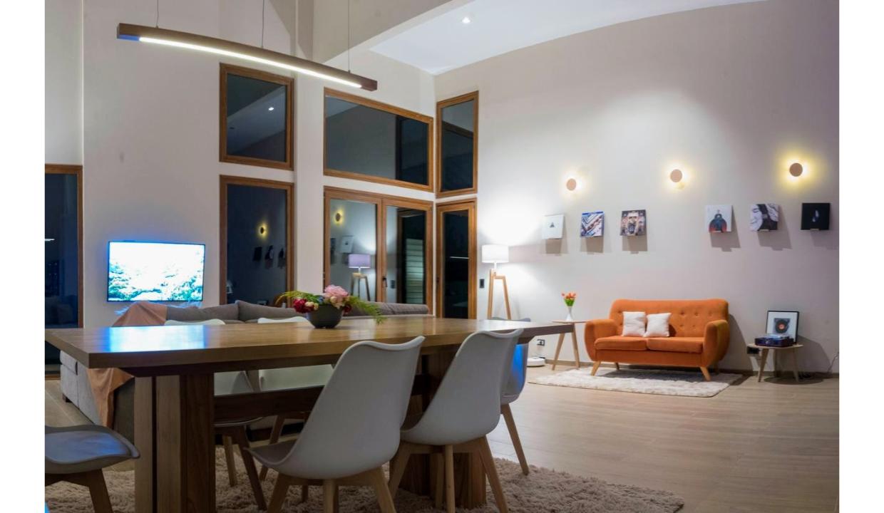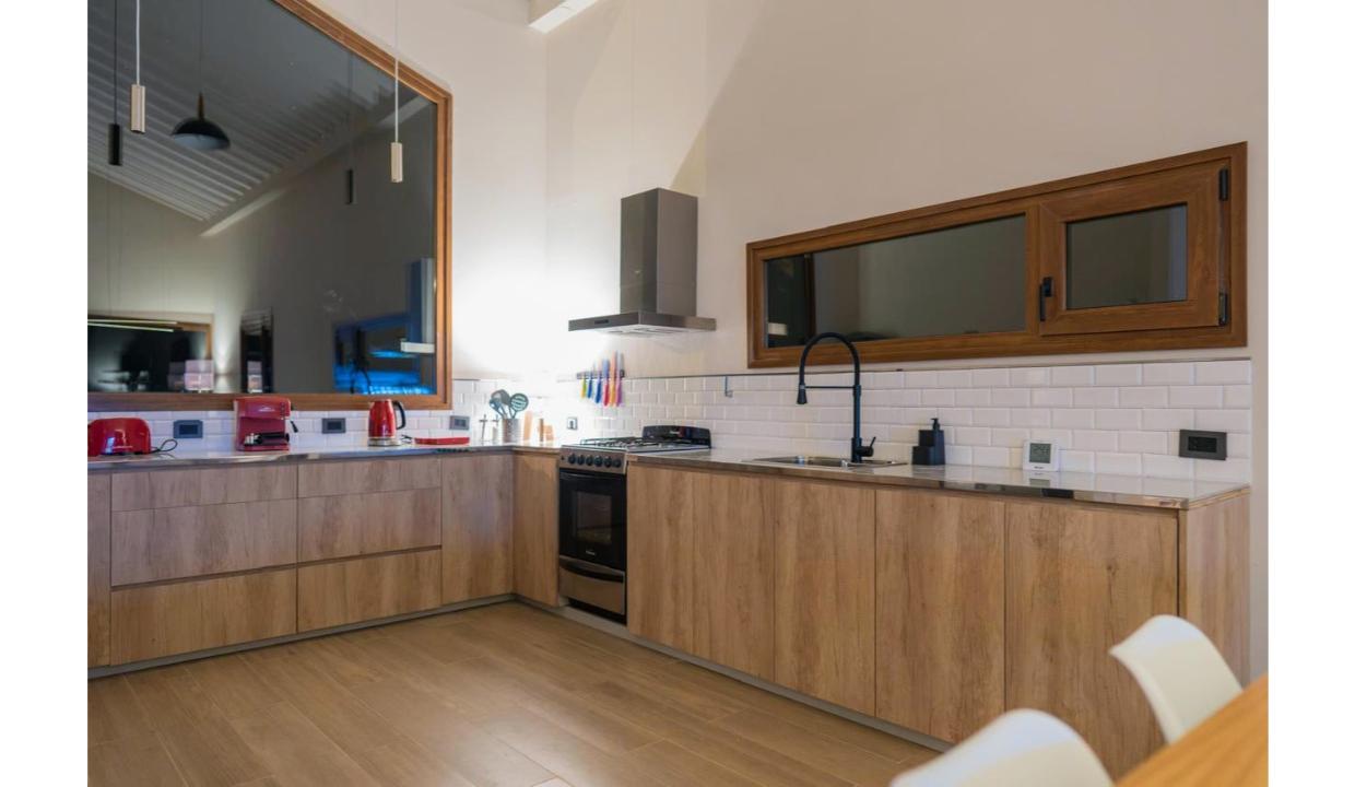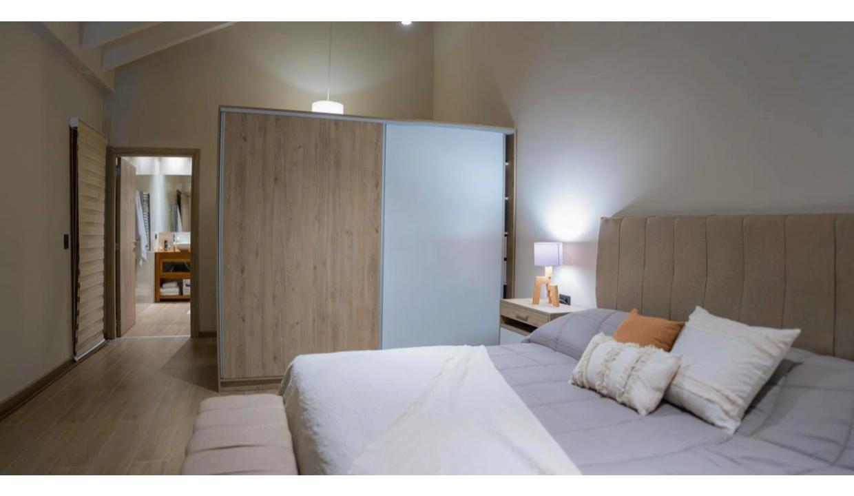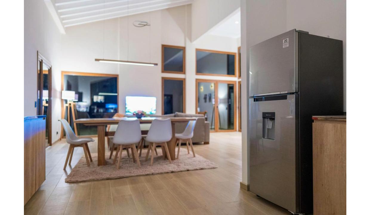 Casa con muy buen estilo, y con muy amplios y comodos ambientes. Planta única de 160m2 rodeada de jardines y bosques con vistas al jardin y a las montañas . La casa esta compuesta por un cuarto frio, toilette en la entrada. Equipada para un máximo de 6 personas, cuenta con un amplio living, un comedor, lugar para escuchar musica en vinilo, y una maquina de juegos Retro. Cómoda cocina con todo lo necesario para una larga estadia. Tiene 3 dormitorios, distribuidos de la siguiente manera: Dormitorio 1: El principal muy amplio, cama King size, con baño en suite (ducha escocesa) con salida al deck. Excelente placard. Dormitorio 2: con cama matrimonial Queen size y placard. Dormitorio 3: con dos camas cuchetas. Baño completo compartido para los dos dormitorios. Lavadero completo. Pileta para lavado y lavarropas con espacio para colgado de ropa, con su tender. Deck con salida desde el comedor y del living, como asi tambien de los dormitorios. Parrilla en la zona del deck. Seguridad permanente en el barrio y acceso a canchas, gym, piscina climatizada, senderos de trekking y espacios deportivos del barrio.