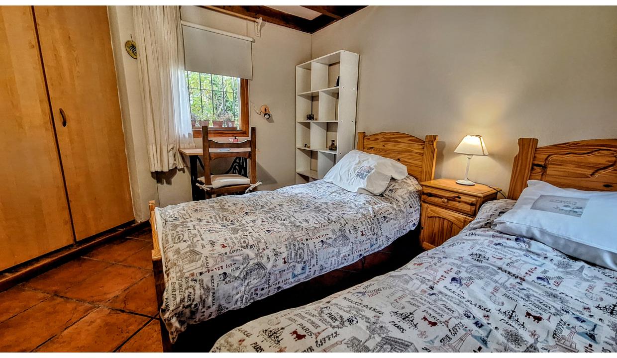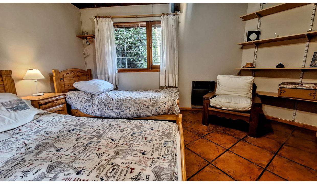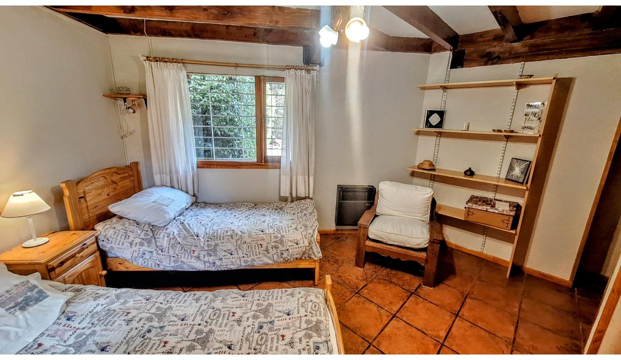 Cabaña independiente, equipada para 5 personas , ubicada en km 7.5 a 2 cuadras de pioneros, cerca del cruce a cerro catedral y de playa bonita. Cuenta con 1 habitación matrimonial, 1 con 2 camas simples y otra con una cama individual. Dos baños con ducha. Cocina equipada, living con tv. Amplio jardín. Chulengo. El auto se deja en la puerta.