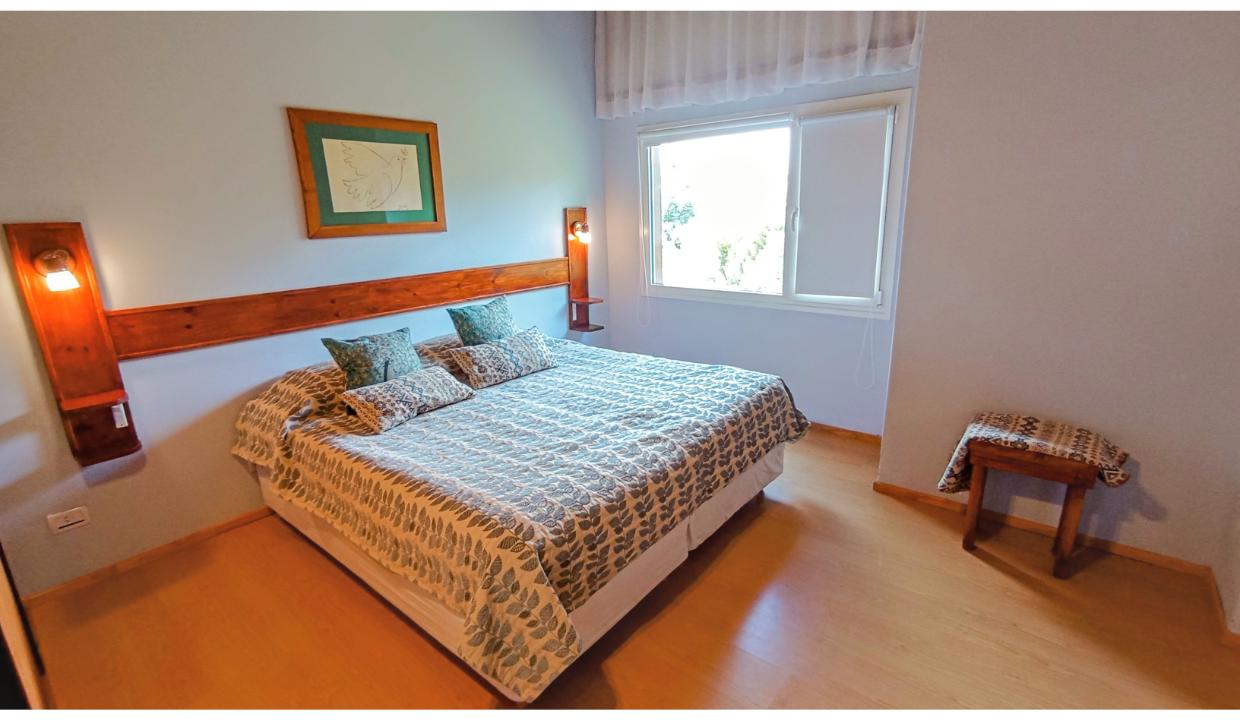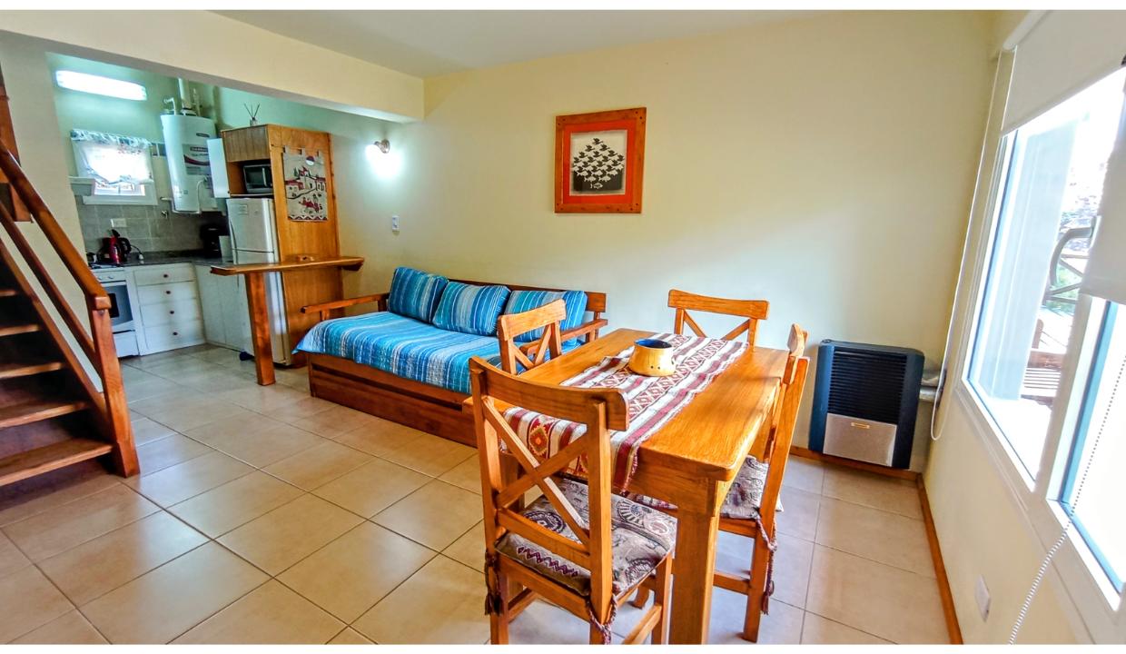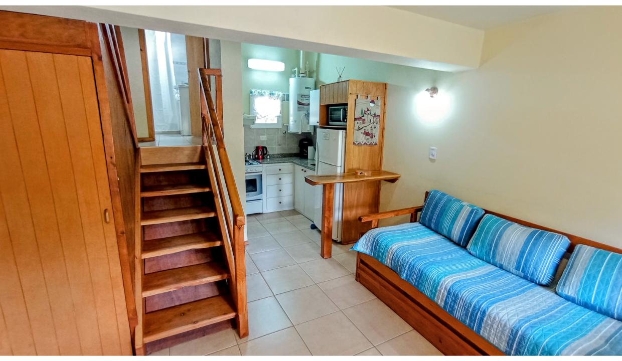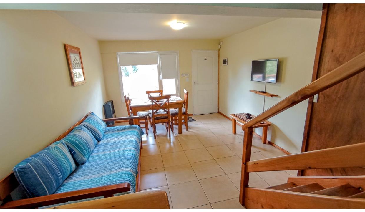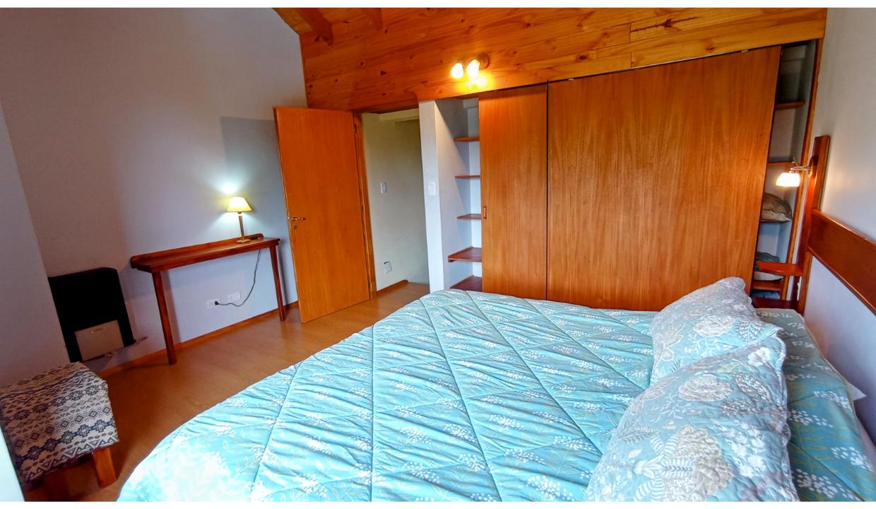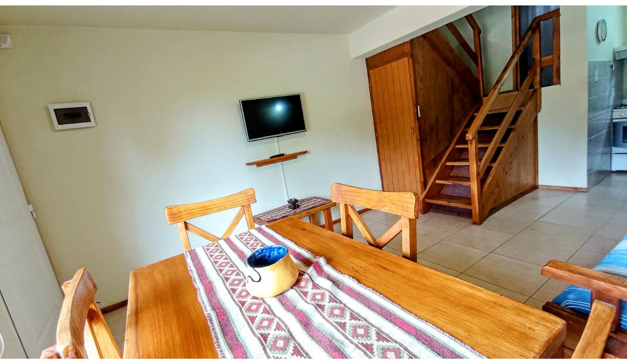 Dos departamentos para 4 personas cada uno, contiguos, iguales. Cada uno tiene en la planta alta una habitación matrimonial o se puede separar en 2 camas individuales. En la planta baja se encuentra el living comedor con una cama carrito cómoda, apto adultos y TV. Cocina equipada. Y en el descanso de la escalera un baño con ducha. Estacionamiento dentro del predio.