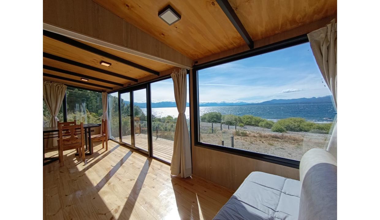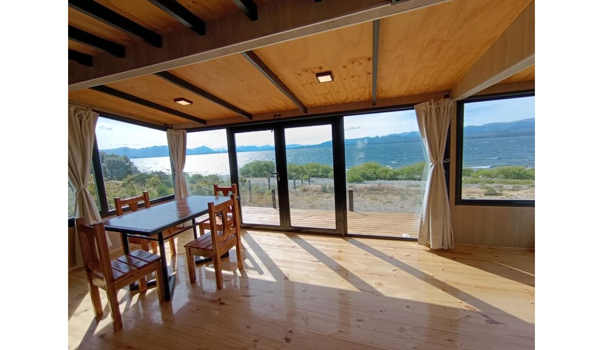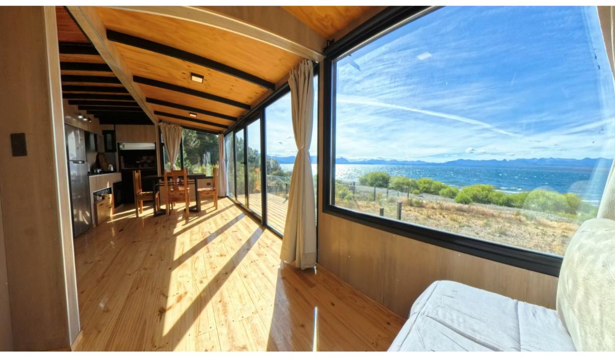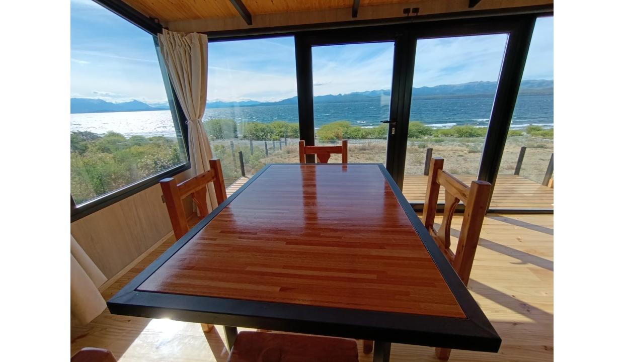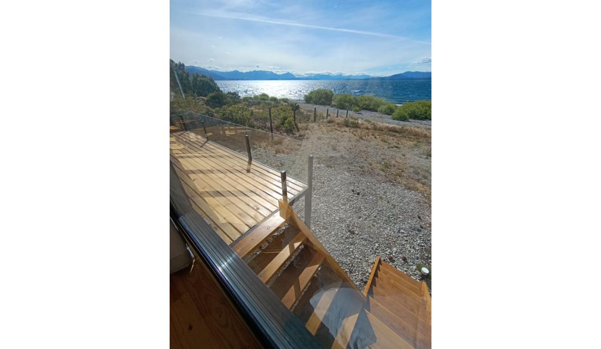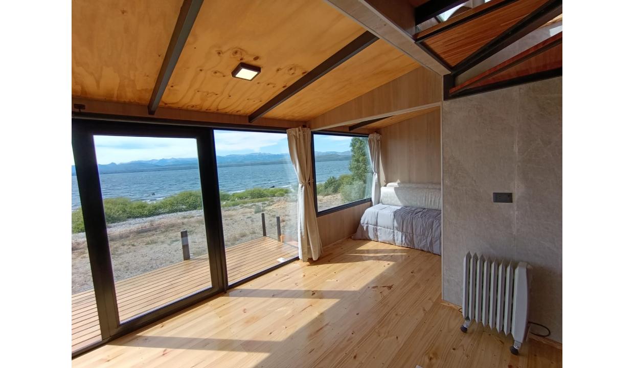 Casa a estrenar con costa de lago, para 4 personas a 15 minutos del centro en auto, en un predio de 3000 mts2 y 0 metros de costa. En la planta alta cuenta con una habitación matrimonial con ventanales al lago. En la planta baja se encuentra la sala de estar con una cama carrito, cocina equipada con anafe y horno eléctricos, bacha inteligente, heladera, pava eléctrica etc, mes comedor, parrilla interior, cortinas blackout. Calefacciones por radiadores (eléctricos).