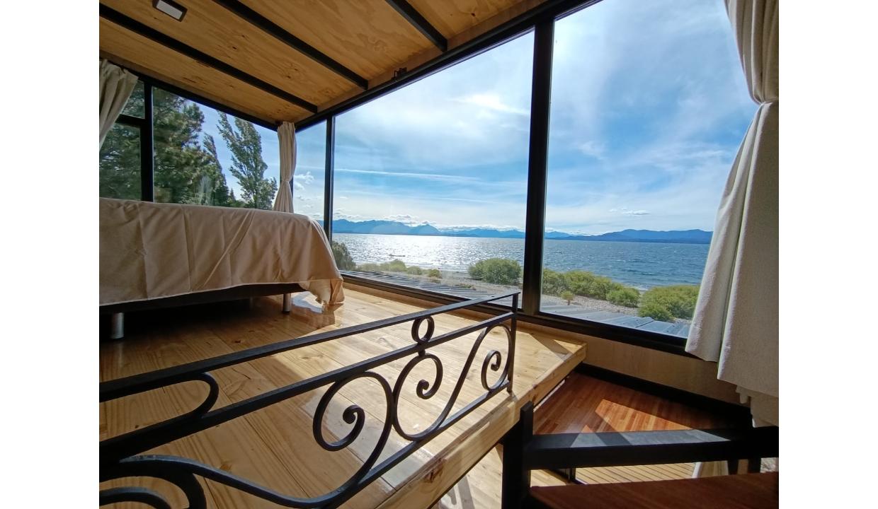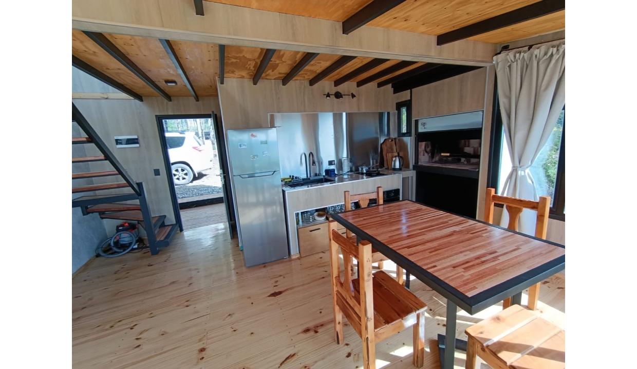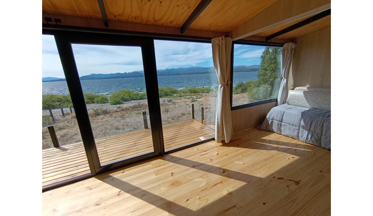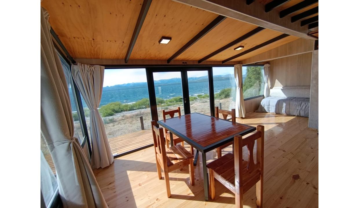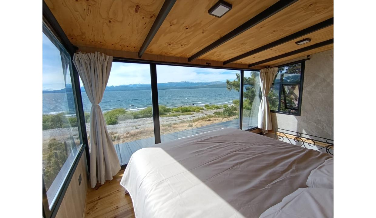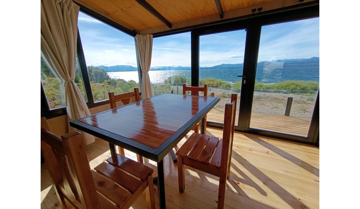 Casa a estrenar con costa de lago, para 4 personas a 15 minutos del centro en auto, en un predio de 3000 mts2 y 0 metros de costa. En la planta alta cuenta con una habitación matrimonial con ventanales al lago. En la planta baja se encuentra la sala de estar con una cama carrito, cocina equipada con anafe y horno eléctricos, bacha inteligente, heladera, pava eléctrica etc, mes comedor, parrilla interior, cortinas blackout. Calefacciones por radiadores (eléctricos).