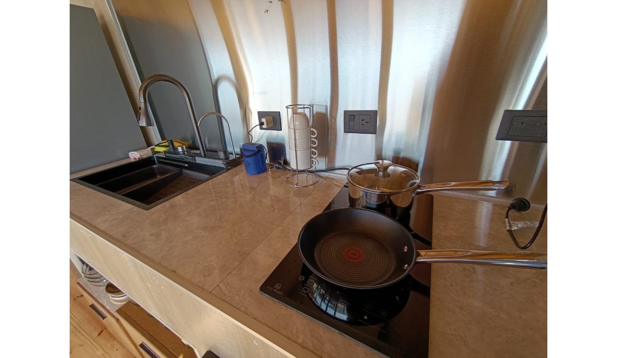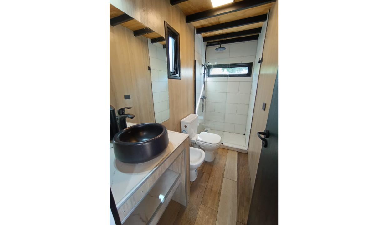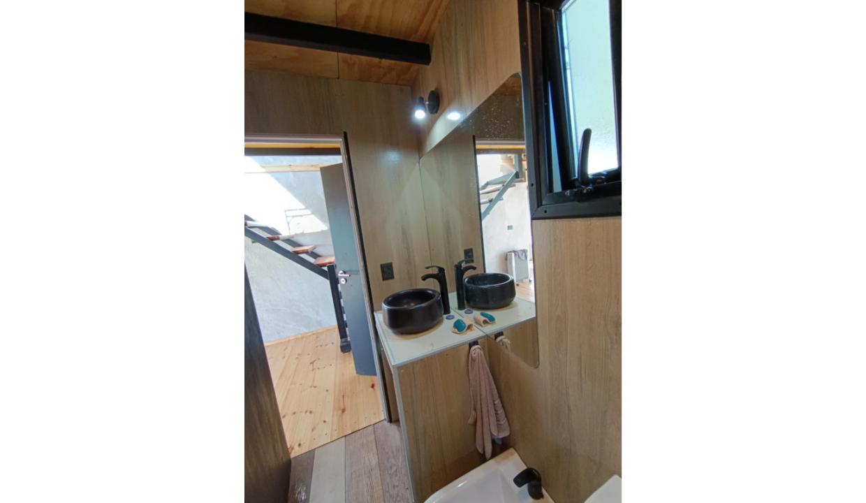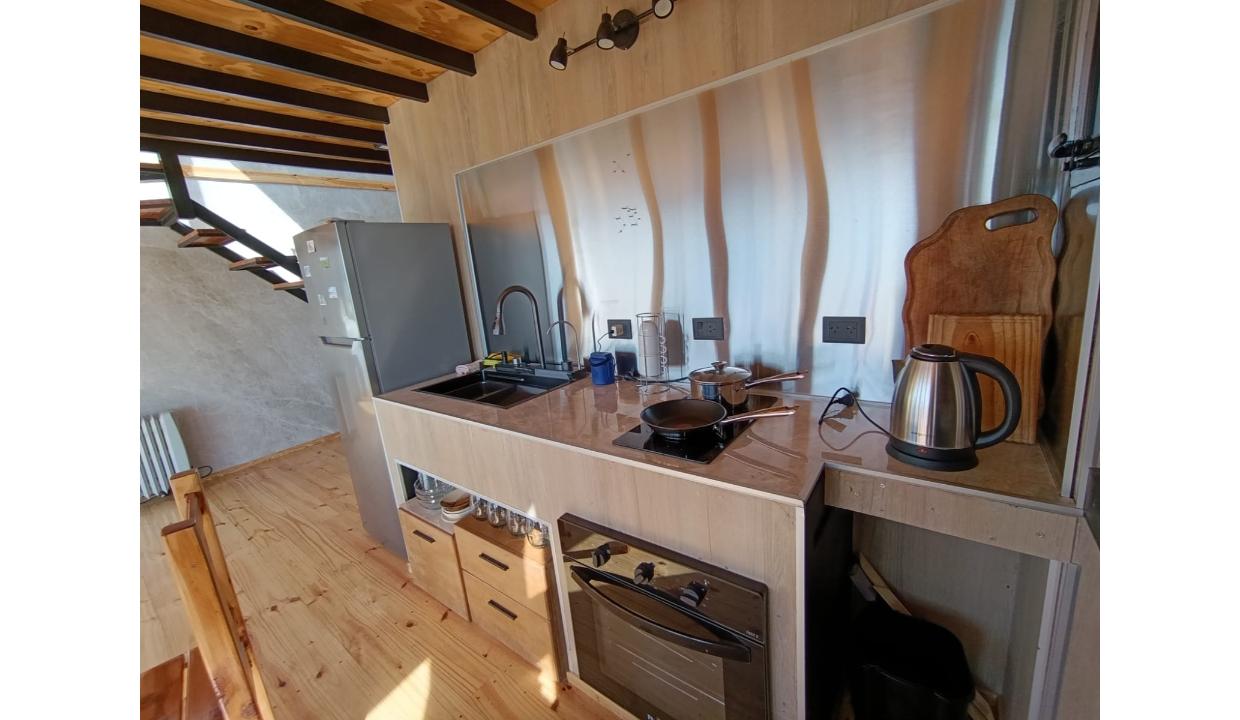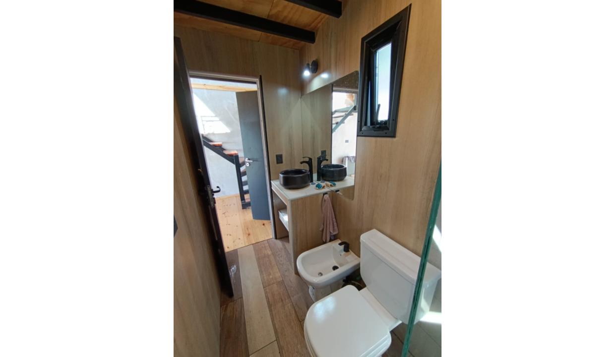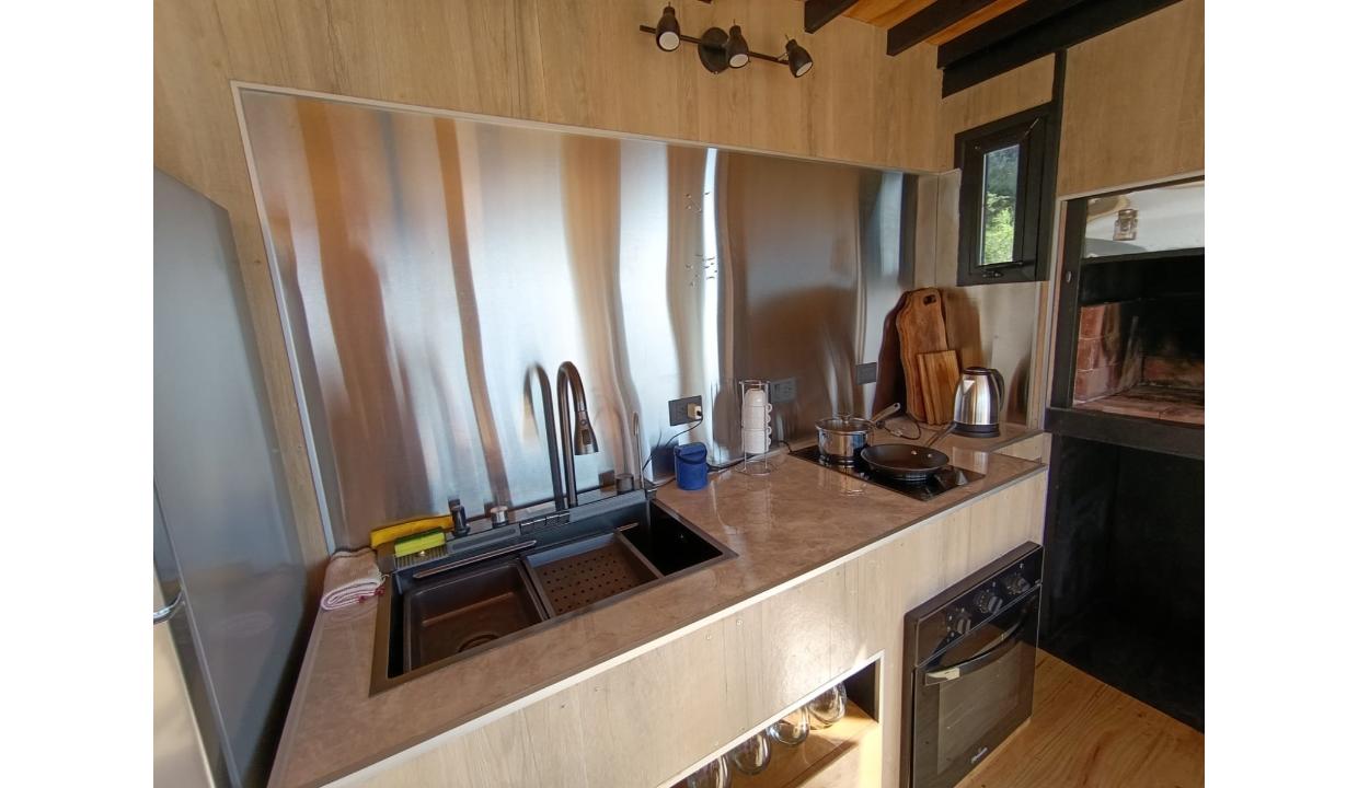 Casa a estrenar con costa de lago, para 4 personas a 15 minutos del centro en auto, en un predio de 3000 mts2 y 0 metros de costa. En la planta alta cuenta con una habitación matrimonial con ventanales al lago. En la planta baja se encuentra la sala de estar con una cama carrito, cocina equipada con anafe y horno eléctricos, bacha inteligente, heladera, pava eléctrica etc, mes comedor, parrilla interior, cortinas blackout. Calefacciones por radiadores (eléctricos).
