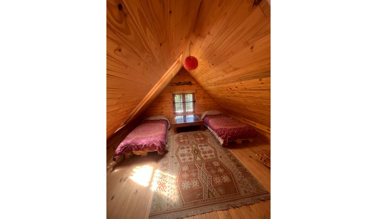 Cabaña de 2 habitaciones equipada para 4 personas. Una habitación matrimonial (PB) y otra con 2 camas individuales(PA). Living comedor con estufa a leña.Un baño con ducha. Cocina completa. Deck con mesa y sillas. Tv, wifi, ropa blanca, Parrilla.