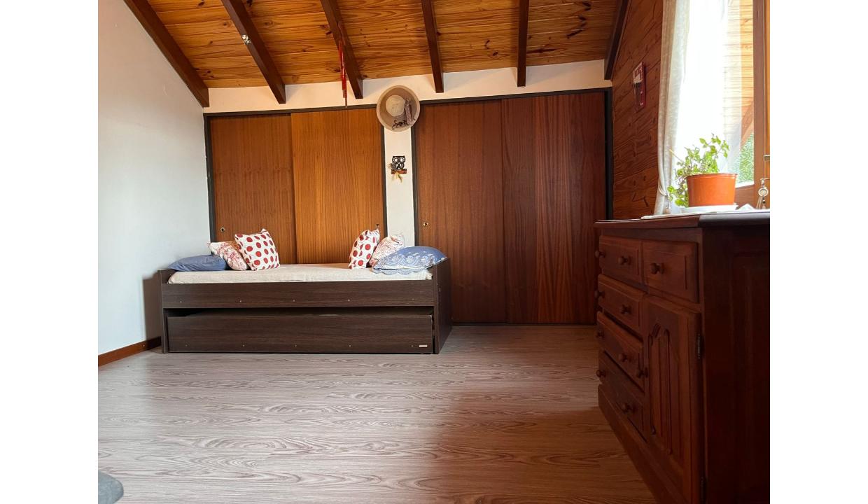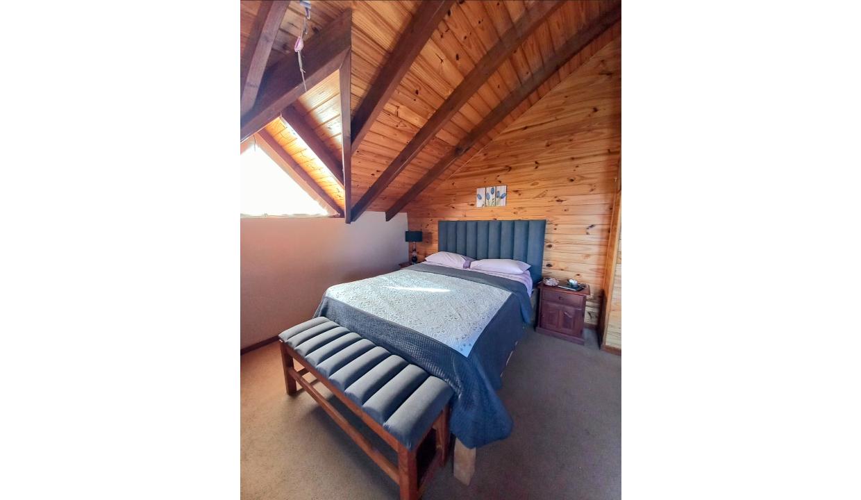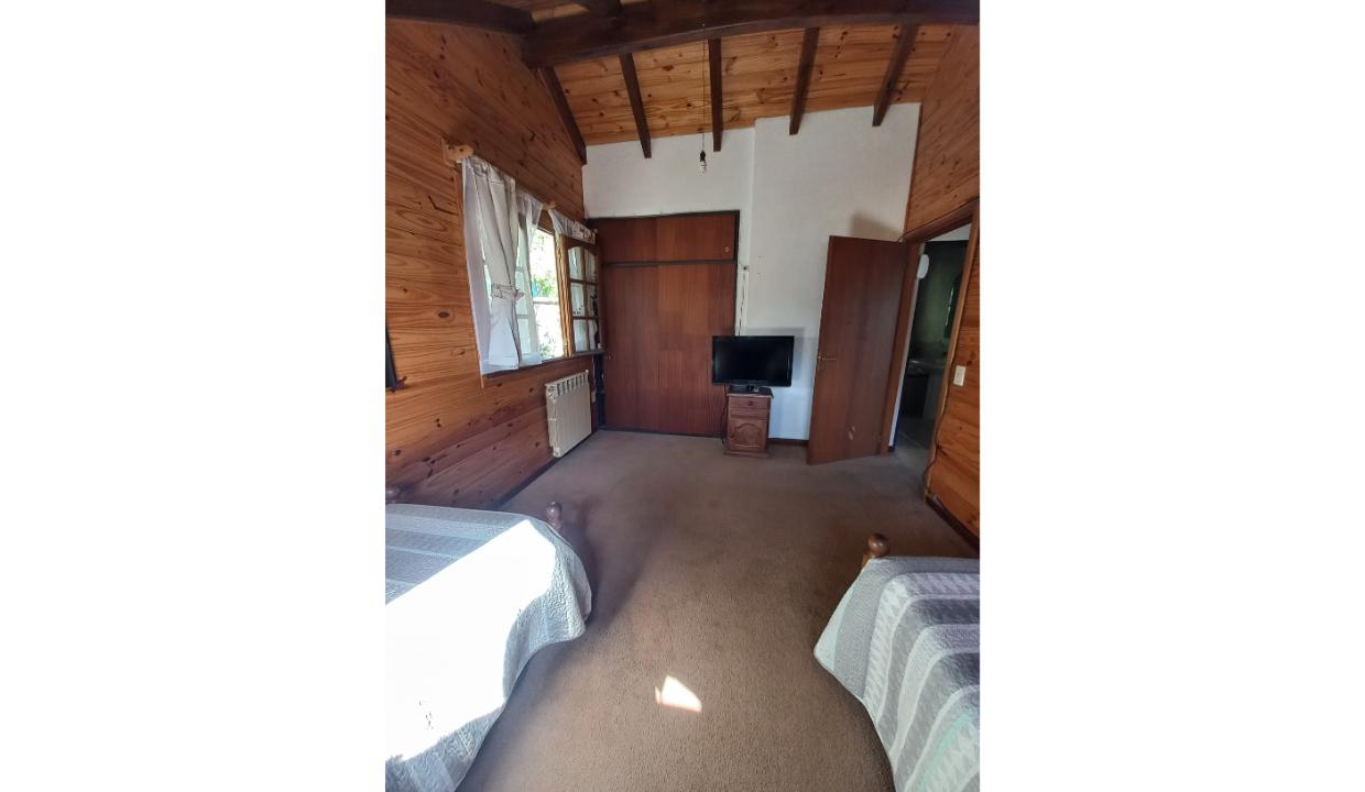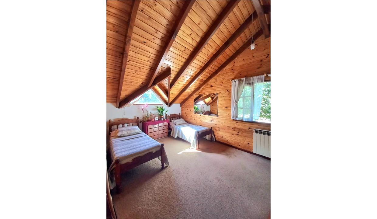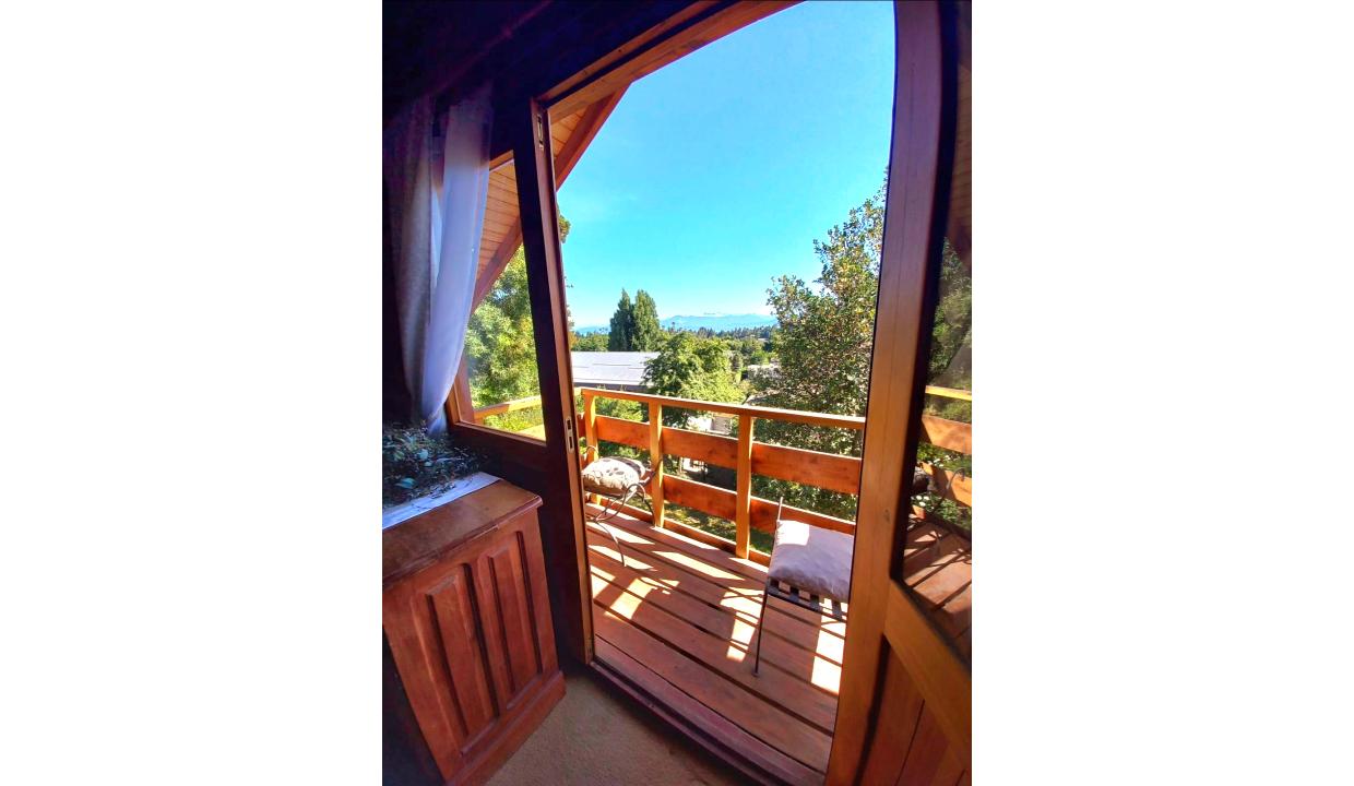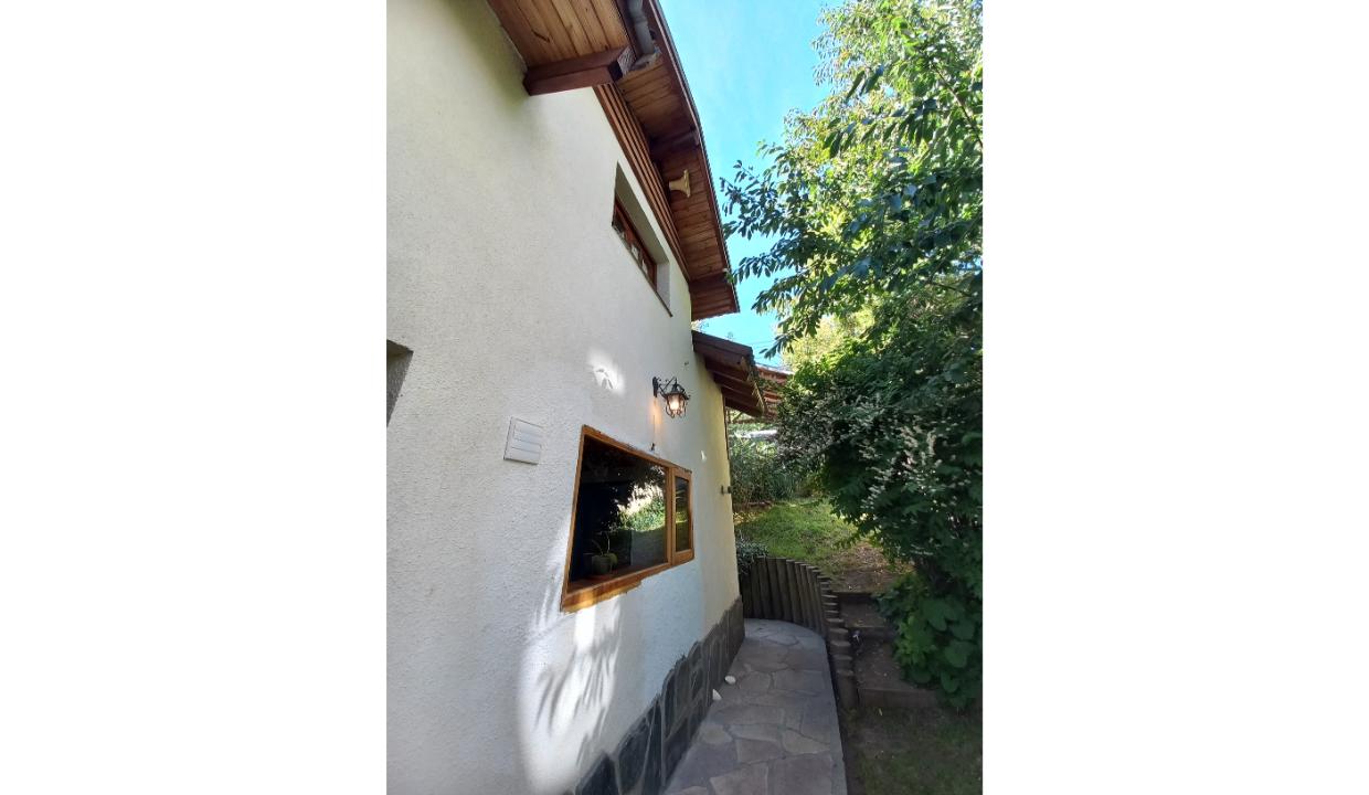 Hermosa casa en dos plantas, ubicada a metros del teleférico cerro otto, cuenta con cochera techada para 2 vehículos. 2 plantas, en planta baja una habitación con cama matrimonial, un baño completo con bañera, living comedor amplio, cocina más lavadero. Planta alta una amplia habitación con cama matrimonial y un sofá cama, baño completo con hidromasaje, y otra habitación con dos camas individuales. Jardín exterior con parilla, deck con sillones y mesa. Vista parcial al lago.